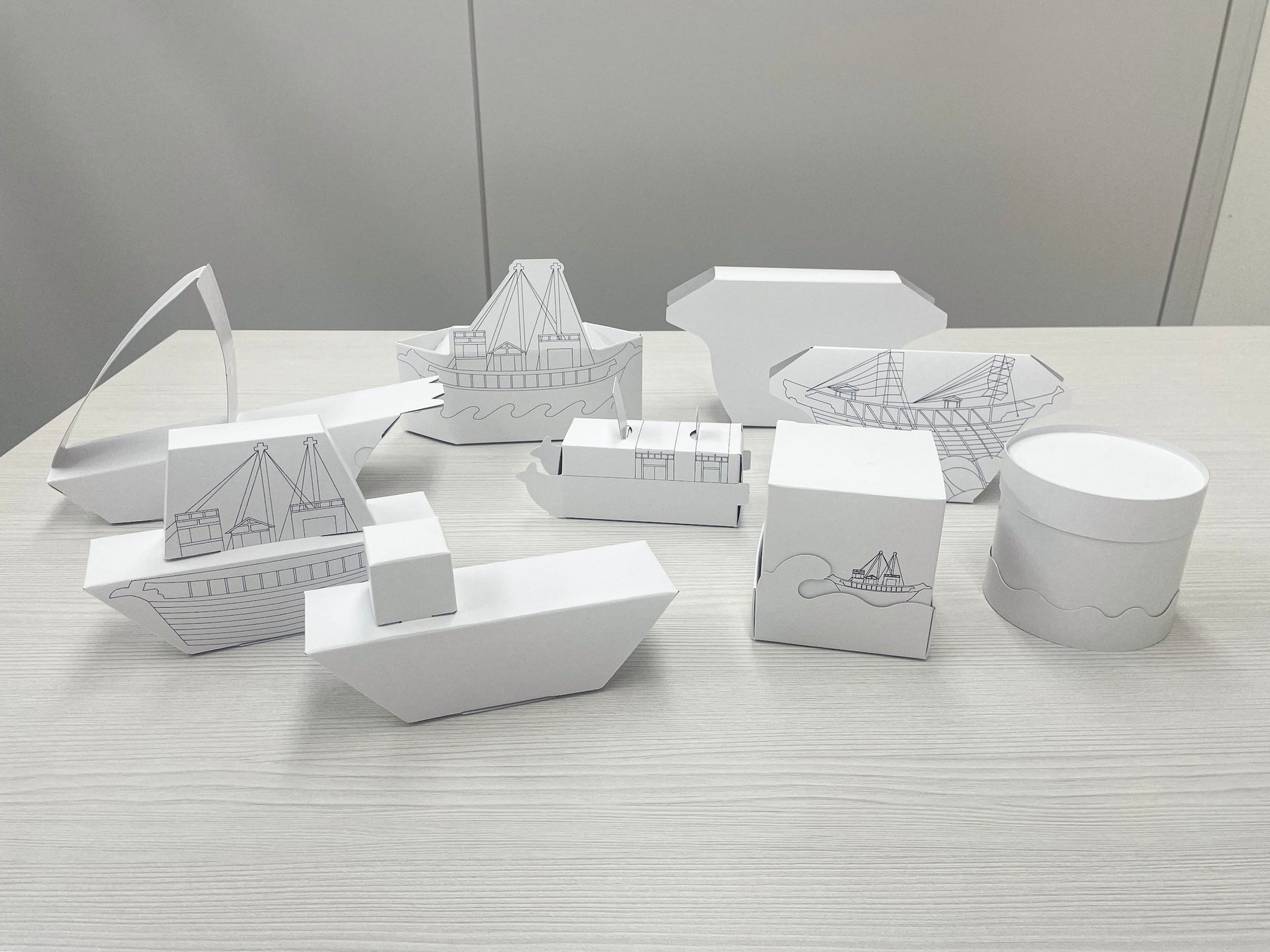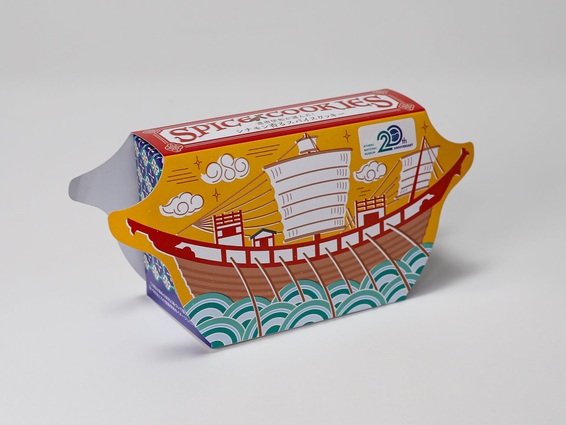 これにヒントを得て製作したのが、遣唐使船の形の箱に入ったシナモン風味のスパイスクッキーです。箱デザインは九州国立博物館監修で、遣唐使船の最新研究に基づき8〜9世紀ごろの姿を反映しています。一見、版ずれしているかのように見えるレトロ調のタッチにし、雲には「989(九博)」の隠れ文字をあしらい、側面は九州国立博物館のロゴと同じカラーリングに整えました。クッキーは香辛料が強すぎると好き嫌いがでてしまうので、程よい風味を求めて試食を重ねました。遣唐使が活躍した時代を身近に感じ、東アジアの中の日本という視野を養う、学びのお供に最適なクッキーです。