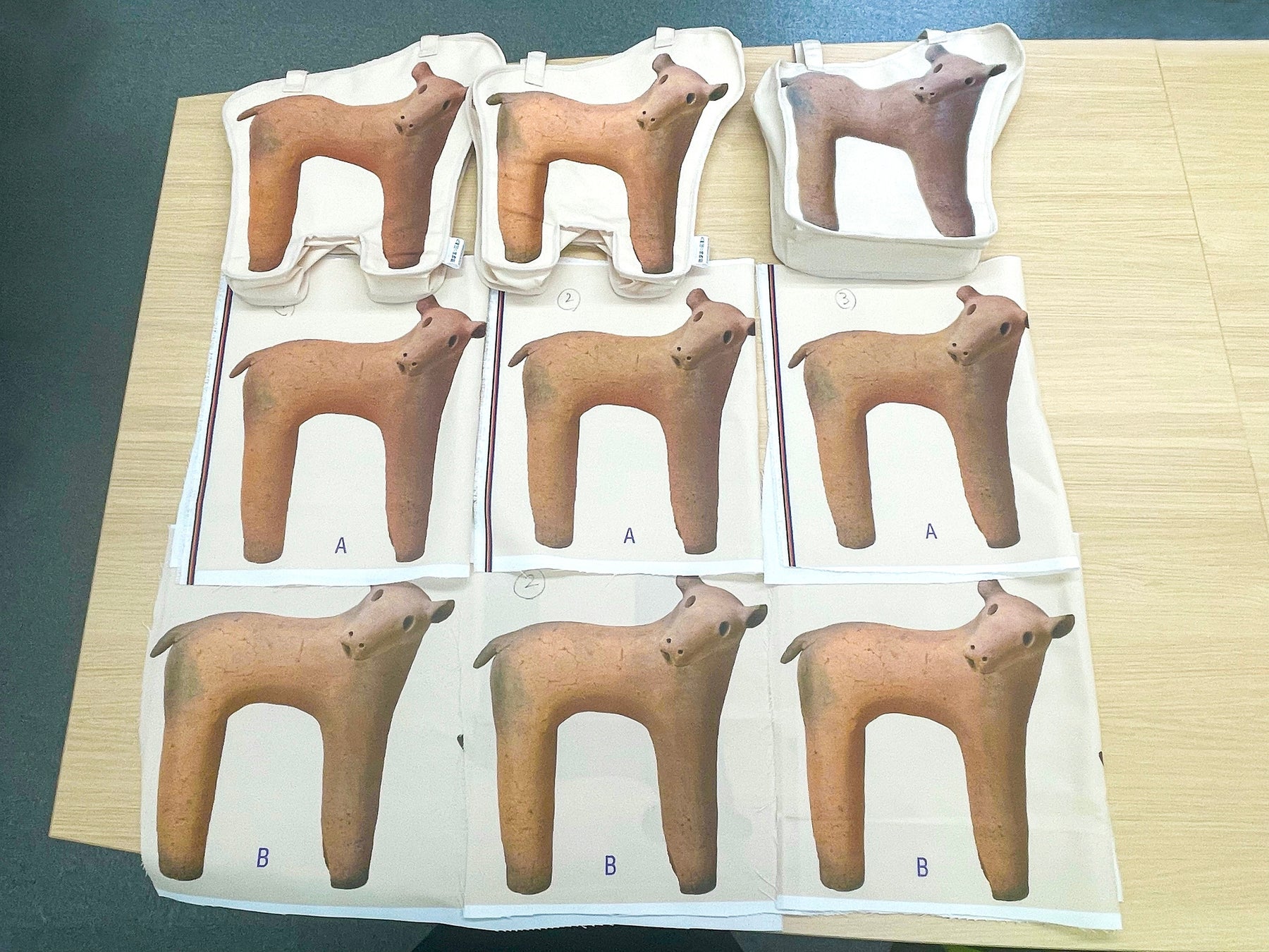 そしてなんといっても足元部分の凹み! バッグの形状については関係者に様々な意見をもらって決めました。奇抜な形でありながら、A4サイズの書類が入る大きさを確保し、日常から遺跡探訪まで、さまざまな実用シーンで使えるように配慮しました。色味も、埴輪の素焼きの色を再現するべく、6パターンもの印刷サンプルをの中から選びました。他では手に入らない、ミュージアムグッズらしさが際立つ唯一無二のトートバッグです。