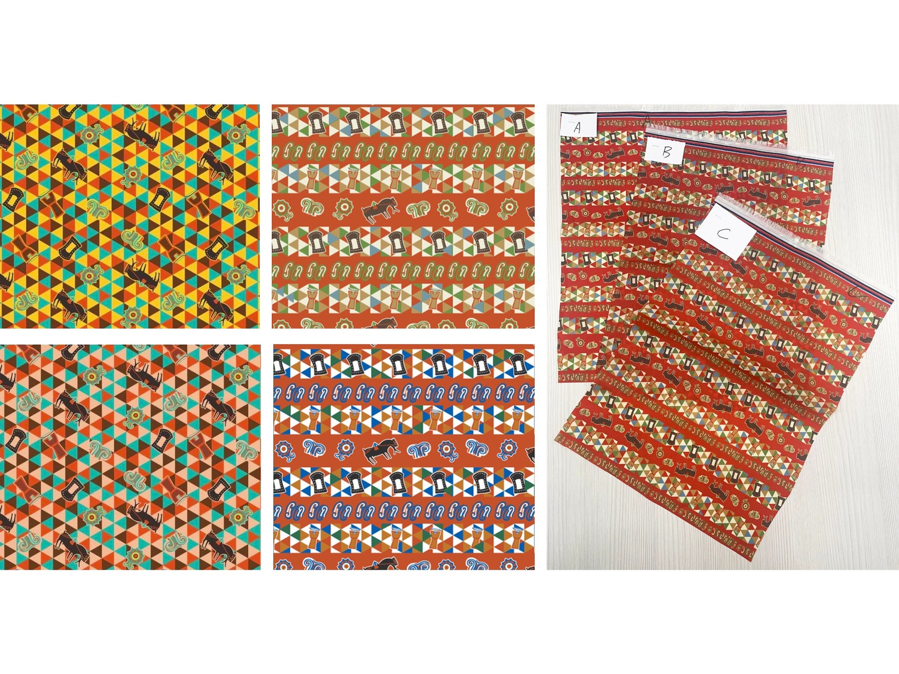 内生地は王塚古墳の石室壁画の最新色彩研究を元に、どこにどの模様を配置して、どんな色にするのか、モチーフの大きさとバランスは? などなど、とことんこだわりました。石室を目にする機会はなかなかありませんが、色鮮やかな壁画を見た時の感動が、ポーチを開くたびに訪れるようにデザインしています。当時の人たちが赤・黒・緑・白・黄・灰(青)の色を使ってどんな思いで描いていたのか、遥か古代に思いを馳せることができるミュージアムグッズです。