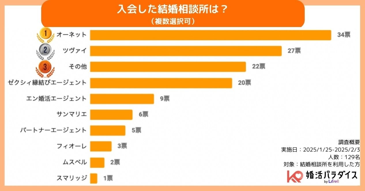利用した結婚相談所は、オーネット(34人)、ツヴァイ(27人)をはじめ大手相談所が上位を占める一方、「その他」(22人)も多く、複数の結婚相談所や地域密着型のサービスを利用するケースも見受けられます。