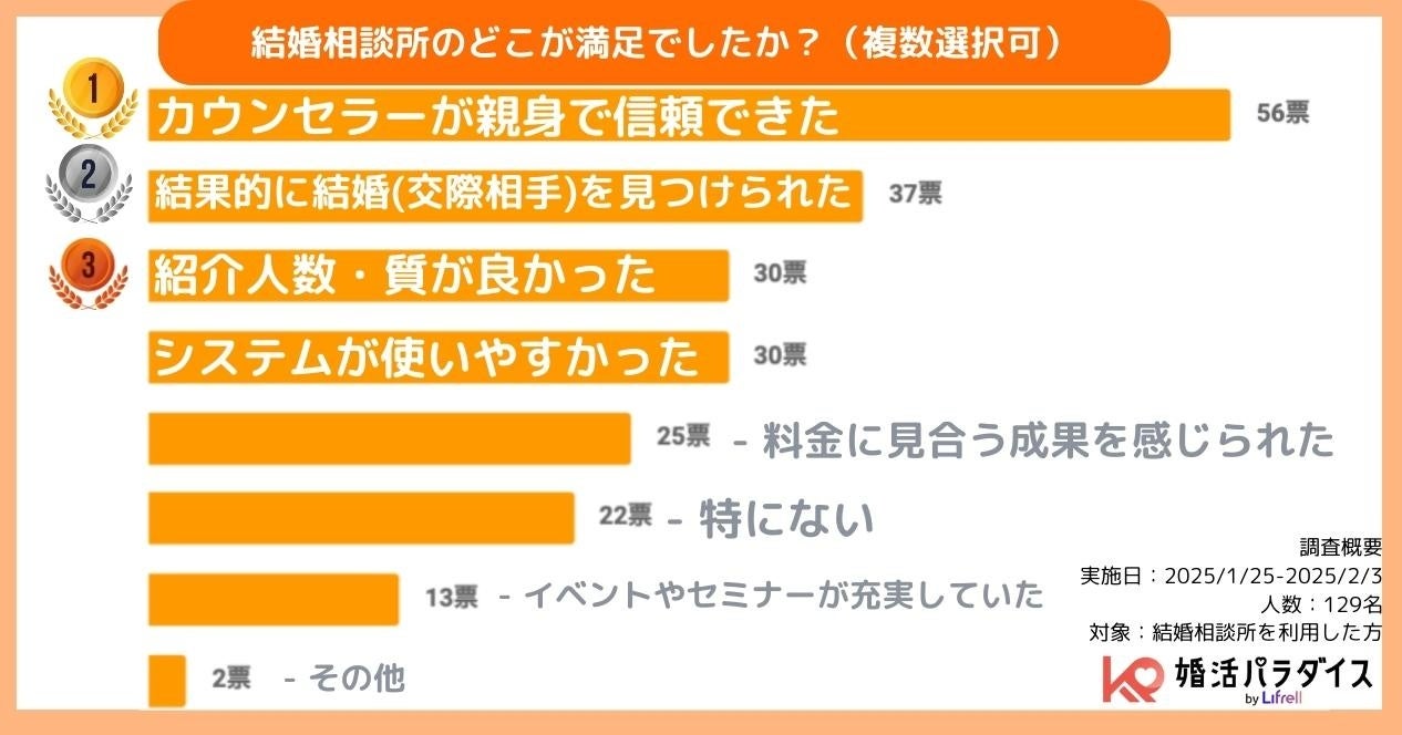 満足度の理由は「カウンセラーが親身で信頼できた」(56票)がトップ。「結果的に結婚(交際相手)を見つけられた」(37票)、「紹介人数・質が良かった」「システムが使いやすかった」(各30票)が続きました。