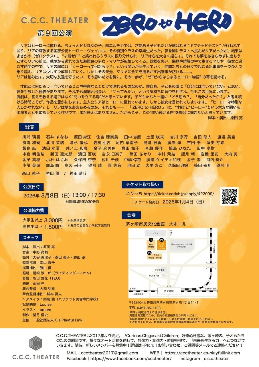2026年3月8日(日)、茅ヶ崎市民文化会館(茅ヶ崎市茅ヶ崎)にて、茅ヶ崎の子どものための劇団「C.C.C.THEATER」による第9回公演ミュージカル『ZERO to HERO』を上演します。上演時刻は、午後1時〜と午後5時30分〜の2回。9回目にして初の大ホール(1,381席)の舞台に、小学生から22歳の53名が挑みます。
