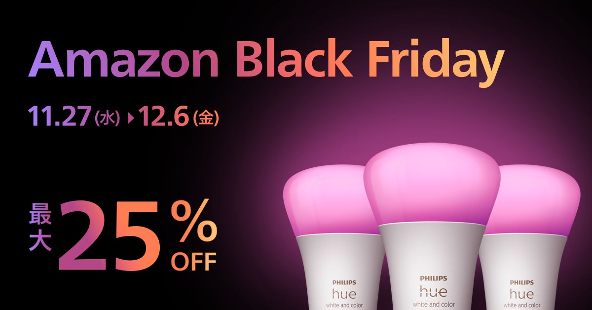 シグニファイジャパン合同会社 (本社:東京都品川区、職務執行者 社長:大塚 圭太郎、以下シグニファイ)は、Amazon で 11月29日(金)0 時から 12月6日(金)23:59 にかけて開催される「Amazon ブラックフライデー」で対象となるおすすめ製品を発表いたしました。対象製品は最大25%オフとなります。