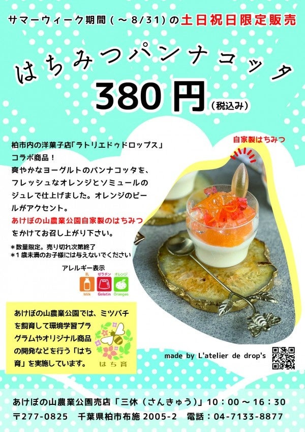 令和5年7月22日(土)~8月31日(木)あけぼの山農業公園にて開催される『サマーウィーク』では、公園自家製はちみつを使用した『はちみつパンナコッタ』を期間限定販売いたします。
