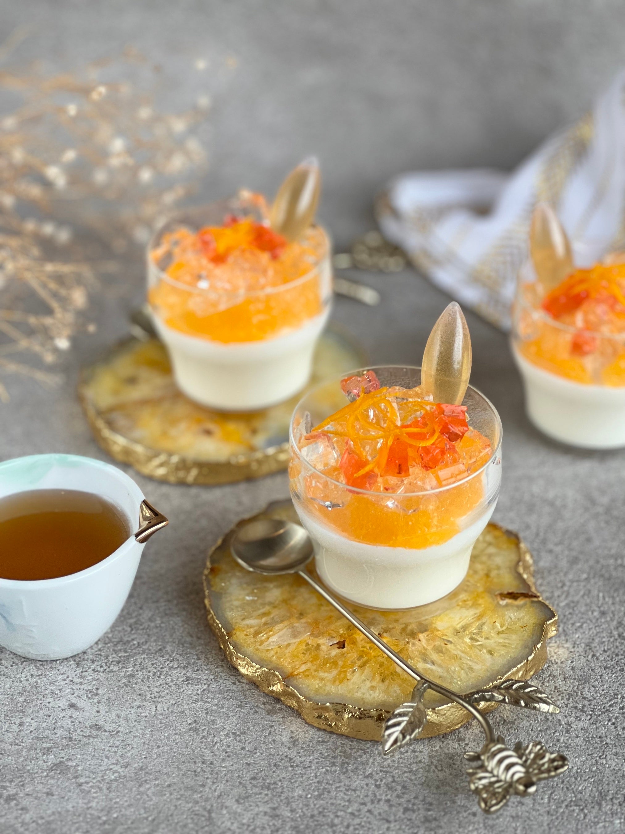 爽やかなヨーグルトパンナコッタの上に、フレッシュなオレンジとソミュールのジュレ、さらにアクセントにオレンジピールが乗っています。これだけでも十分美味しいのですが、今回の目玉は『公園自家製のはちみつ』です。公園で飼育しているミツバチが集めたはちみつをたっぷりとかけてお召し上がりください。