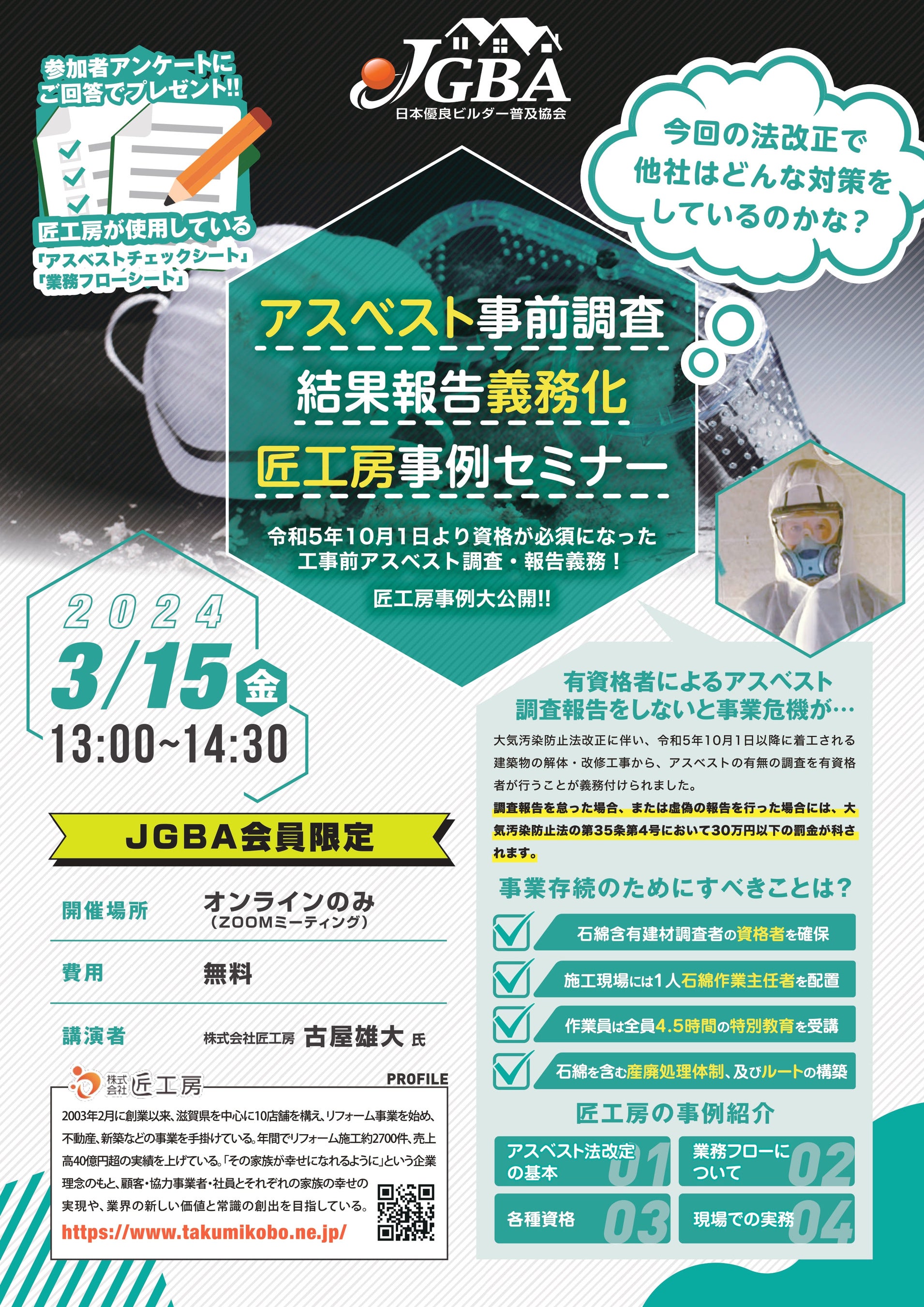「リアル」にこだわった学びの機会を積極的に提供しているJGBAでは、シンポジウムや会員企業の現地視察ツアーなどのほか、会員限定のセミナーも開催し、法や制度の改正などに伴う会員企業の実務対応などへのサポートを図っています。3月15日(金)には、昨年10月より資格が必須となった工事前アスベスト調査・報告をテーマに、会員企業限定の無料セミナーをオンラインで開催。協会役員の関孝治氏が代表取締役会長を務める株式会社匠工房の対応施策を公開し、会員企業の50人が参加しました。