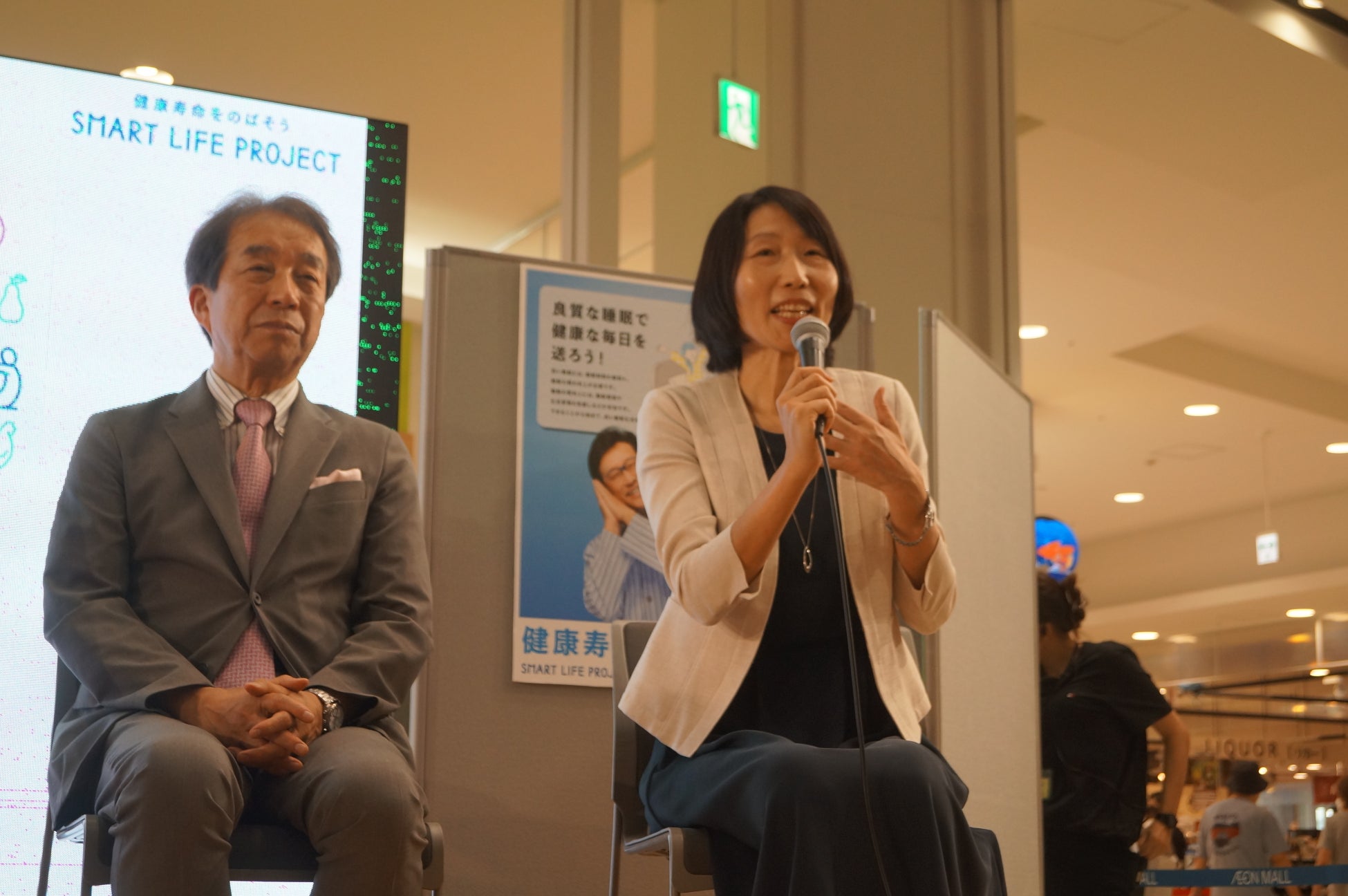 この取り組みのスタートに合わせたPRイベントを、9月15日(日)イオンモール大和郡山 北小路コートで開催しました。イベントには睡眠に関する専門家のほか、ゲストにお笑いコンビのかつみ♡さゆりさん、七面綺蘭さんが登場し、トークセッションを通して会場を盛り上げていただきました。