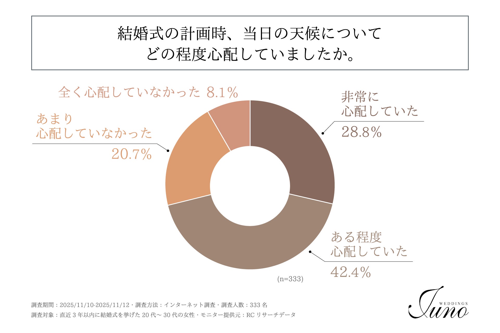直近3年以内に結婚式を挙げた20代〜30代の女性の7割以上が、程度の差こそあれ当日の天候を心配していた