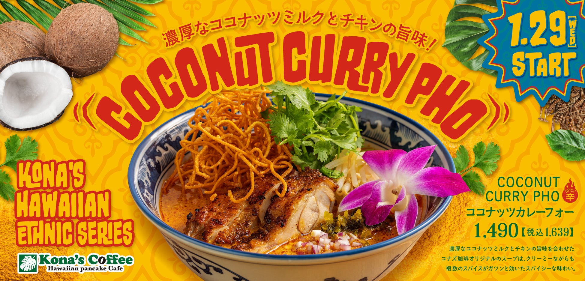 ハワイを感じる濃厚なココナッツミルクと複数のスパイスが香り高い「ココナッツカレーフォー」を2025年1月29日(水)から全国のコナズ珈琲にて新発売!