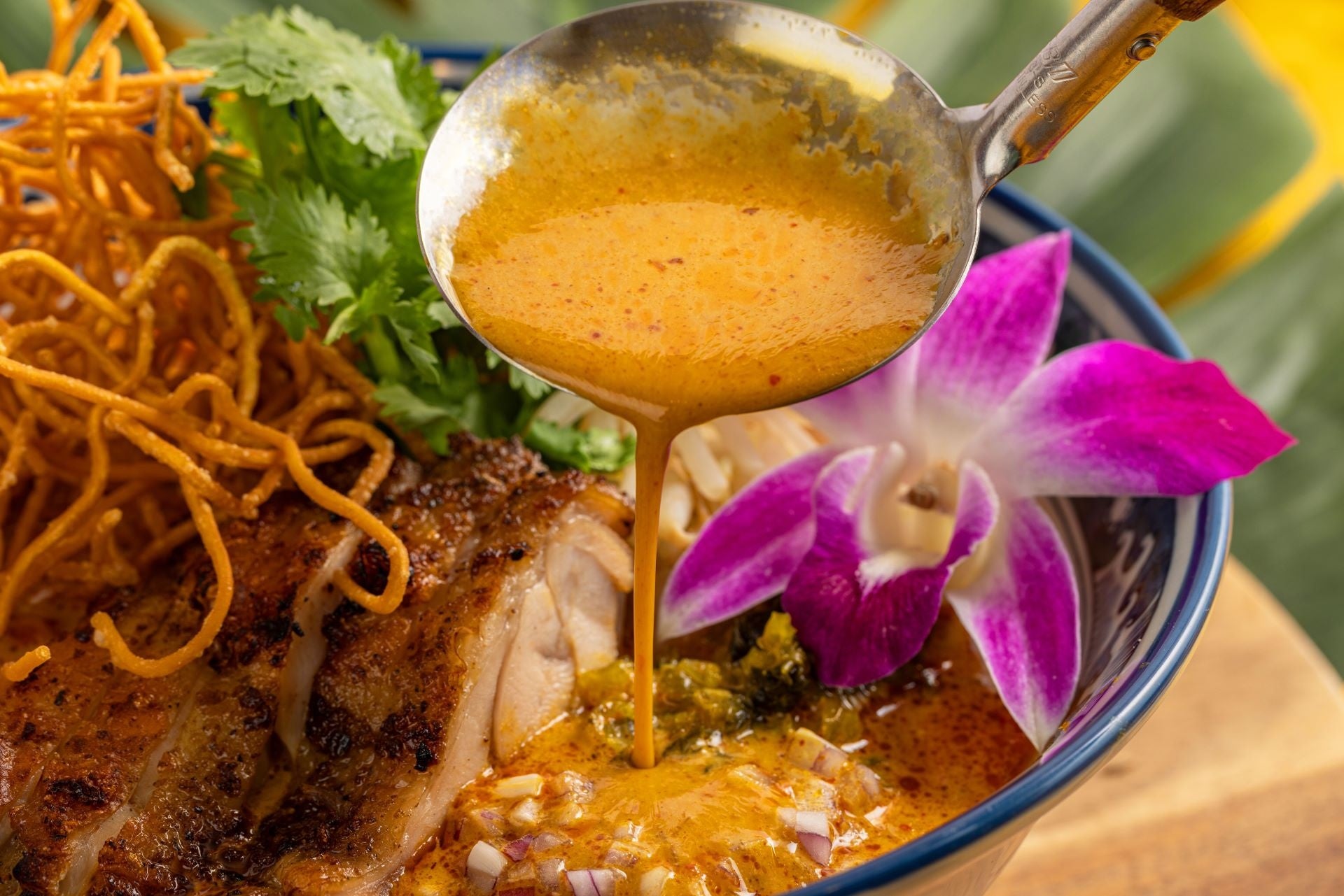 “ハワイアンエスニック”を掲げたシリーズは、近年、夏の期間限定メニューとして販売し、多くのお客さまにご好評をいただいてまいりました。ハワイには様々な地域から人が移り住み、多様な文化を織りなしています。ハワイでも愛されているエスニック料理を、コナズ珈琲ならではの“ハワイアンエスニック”としてご用意しています。5年目となる2025年は、新しい試みとして、寒い冬にぴったりの新商品を開発しました。タイで親しまれている“カオソーイ”をヒントにした「ココナッツカレーフォー」は、ハワイを感じる濃厚なココナッツミルクと、複数のスパイスのハーモニーが香り高く合わさっています。さらにフライヌードルをトッピングすることで、何度も食べたくなるような食感の変化もお楽しみいただけます。
