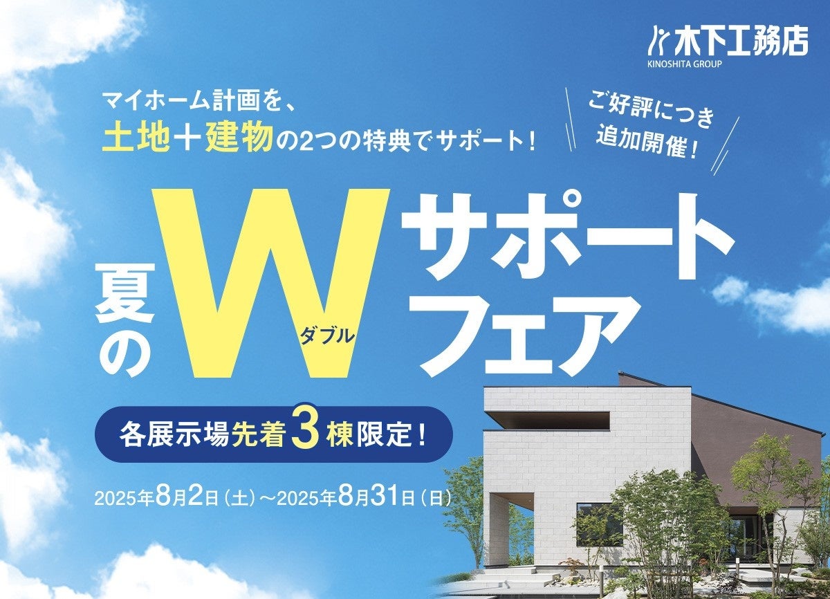 木下グループ 株式会社木下工務店(本社:東京都新宿区/代表取締役:田中耕三郎)は、「夏のW(ダブル)サポートフェア」を2025年8月2日(土)から2025年8月31日(日)までの期間限定で追加開催することをお知らせします。追加開催は、全国の木下工務店の各住宅展示場先着3棟限り。土地から住まいづくりをお考えのご家族を、土地購入サポートと住まいの性能アップの両面から応援するお得な特典をプレゼントいたします。