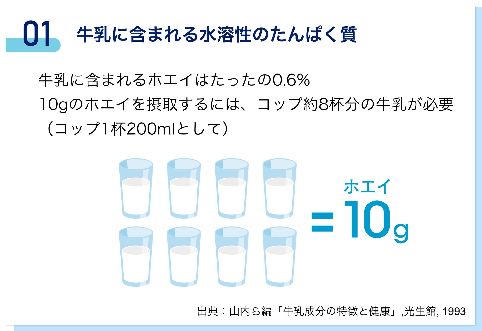 ホエイプロテインとは、牛乳に含まれる水溶性のたんぱく質です。カラダでの保持率が高く※1、カラダに重要な分岐鎖アミノ酸(BCAA)が豊富で※2、吸収のスピードが速い※3とされています。「アイソカル クリア」に含まれる10gのホエイを摂取するには、コップ約8杯分の牛乳が必要※4です。
