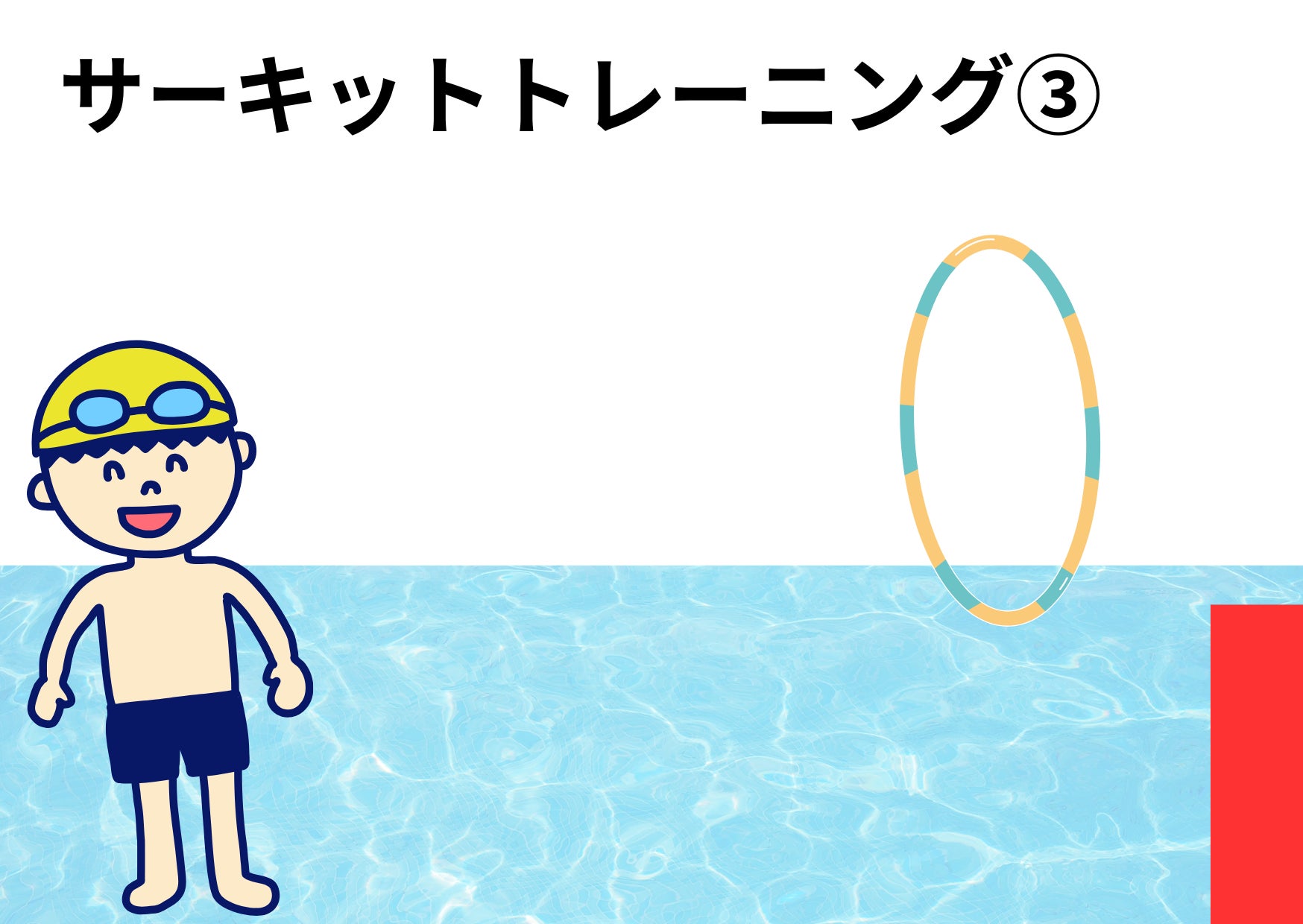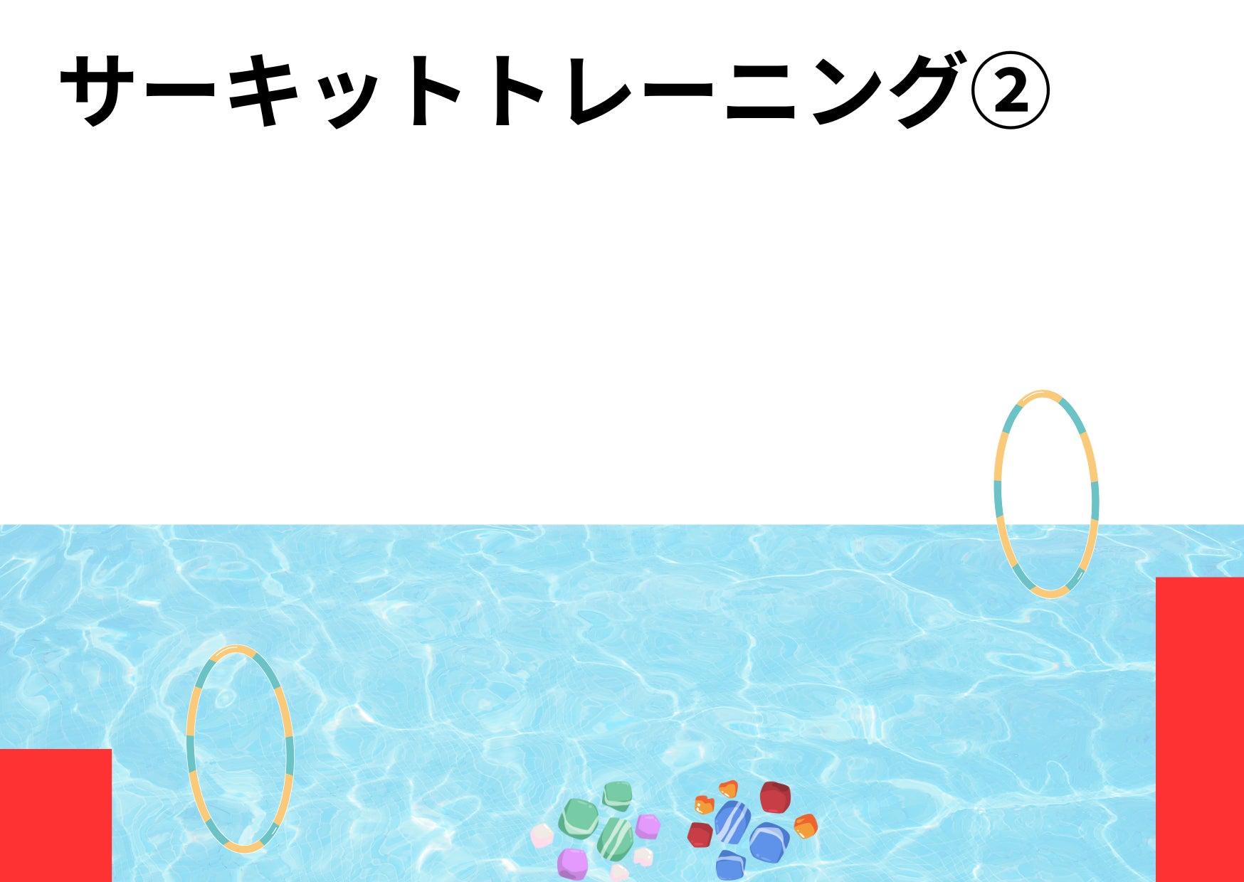 ②→③、③→④、④→①は子どもたちのレベルに合わせ、赤台ジャンプから歩行、赤台ジャンプからバタ足、赤台ジャンプからクロールなどを行う。