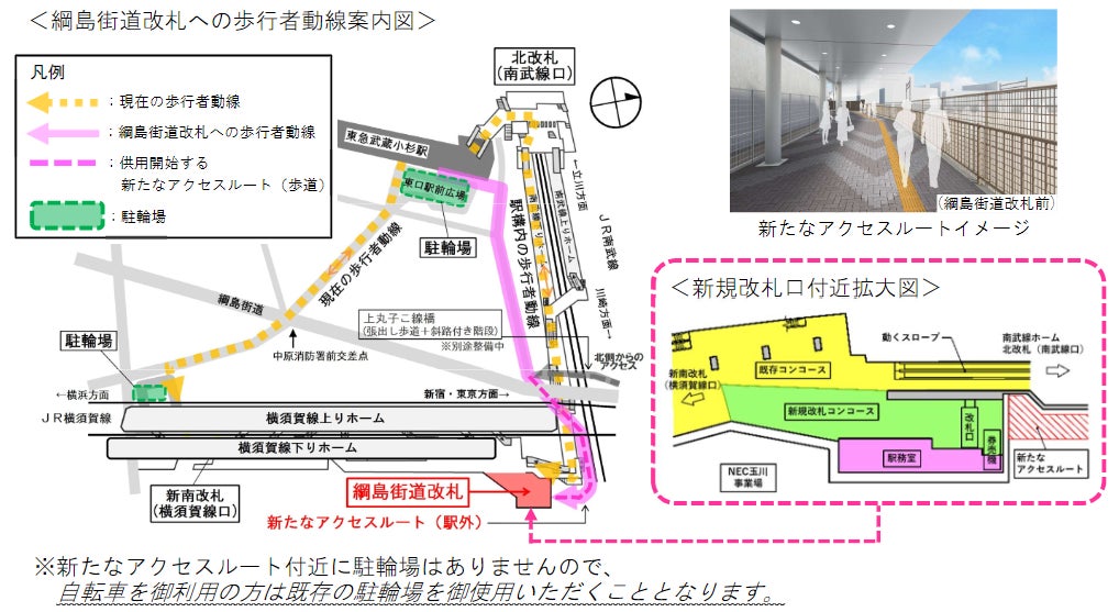 川崎市とJR東日本は、JR武蔵小杉駅の駅構内及び駅周辺の歩行者の分散化による混雑緩和と南武線北側からのアクセス性の向上を図るため、新規改札口設置工事の施行に関する協定を2022年6月17日に締結し、工事を進めてまいりました。