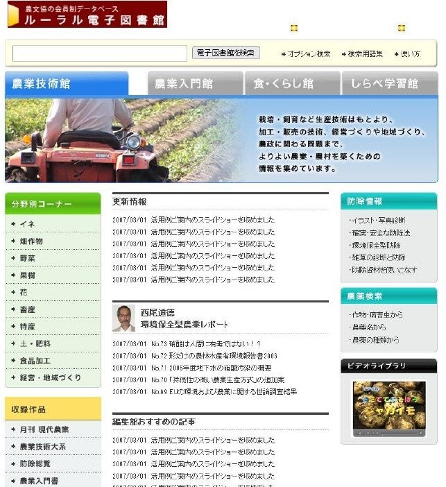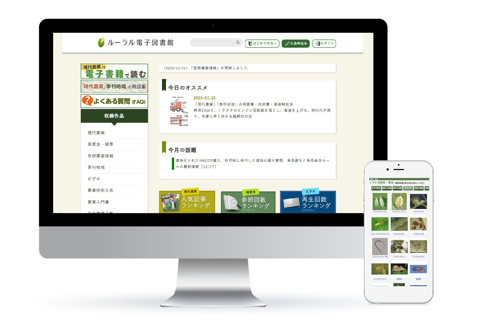 ルーラル電子図書館は、一般社団法人農山漁村文化協会(農文協)が運営する「有料・会員制の農業情報提供サイト」です。農文協が発行した雑誌・書籍・事典・ビデオなどを多数収録しており、病害虫の診断から登録農薬の情報、栽培・飼育の技術、加工・販売のノウハウまで、さまざまな角度から農業に関する情報を検索・閲覧することができます。