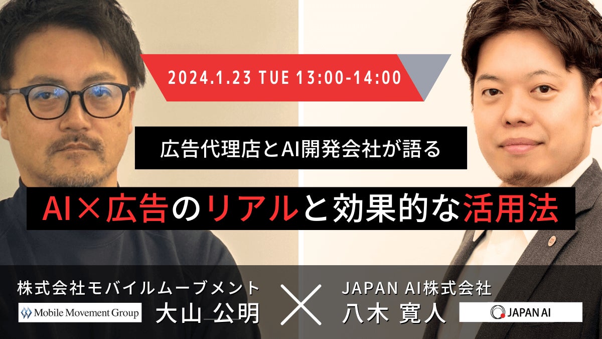 株式会社モバイルムーブメント(本社:東京都渋谷区、代表取締役:田中 秀明、以下 モバイルムーブメント)とJAPAN AI株式会社(本社:東京都新宿区、代表取締役社長:工藤 智昭、以下JAPAN AI)は、1/23(火) にAIを活用した広告運用の実態について解説するオンラインセミナーを開催します。