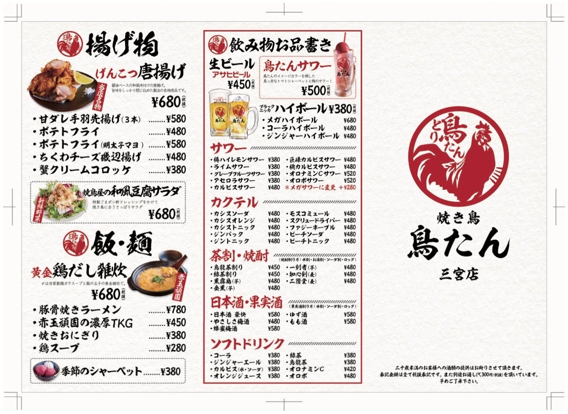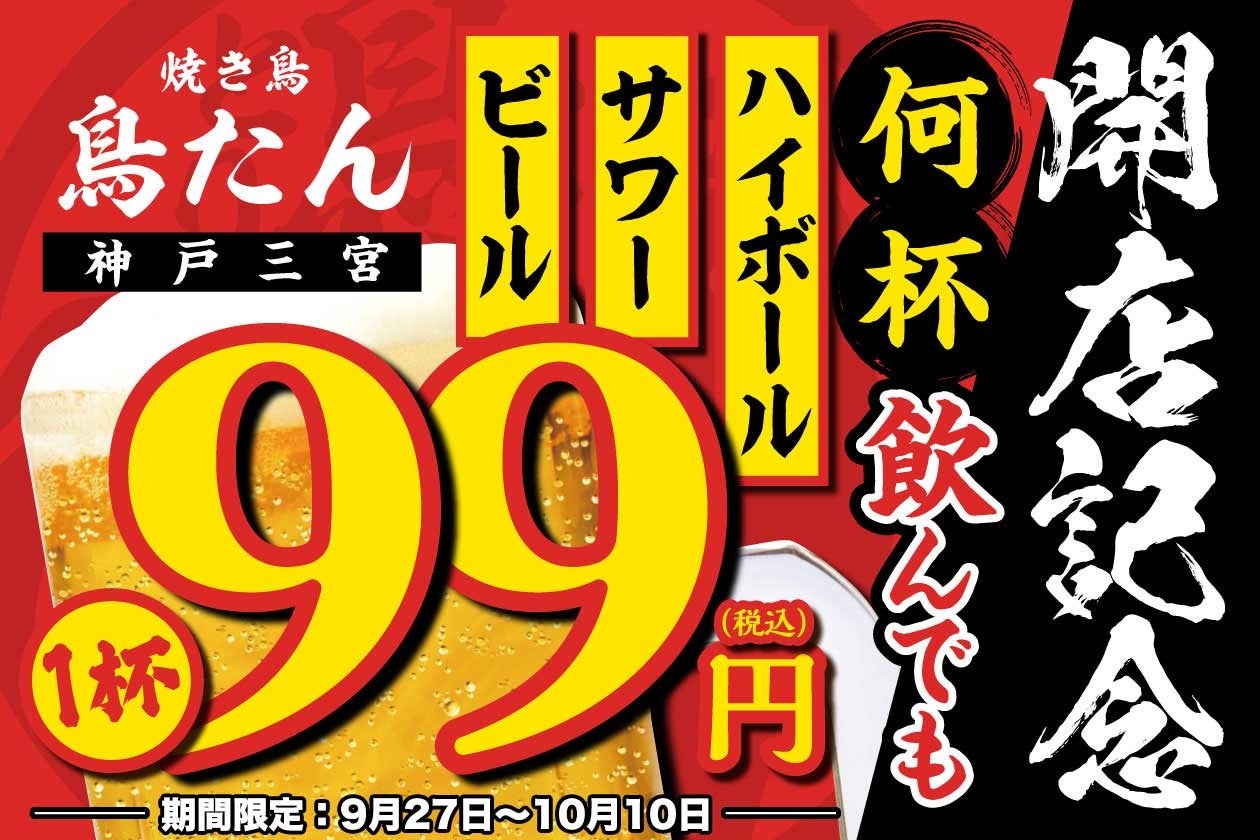 【生ビール・ハイボール・サワーが何杯飲んでも1杯99円】オープンを記念して「焼き鳥 鳥たん 三宮」にて9月27日(金)~10月10日(木)の期間限定で開催