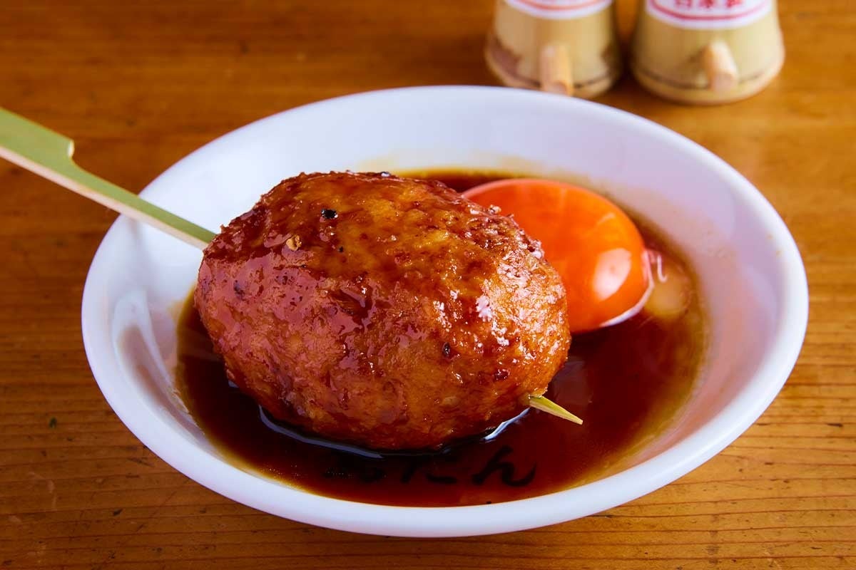 税伝レシピの大玉自家製鶏つくね。香ばしさとジューシーさを持つ自慢の逸品。