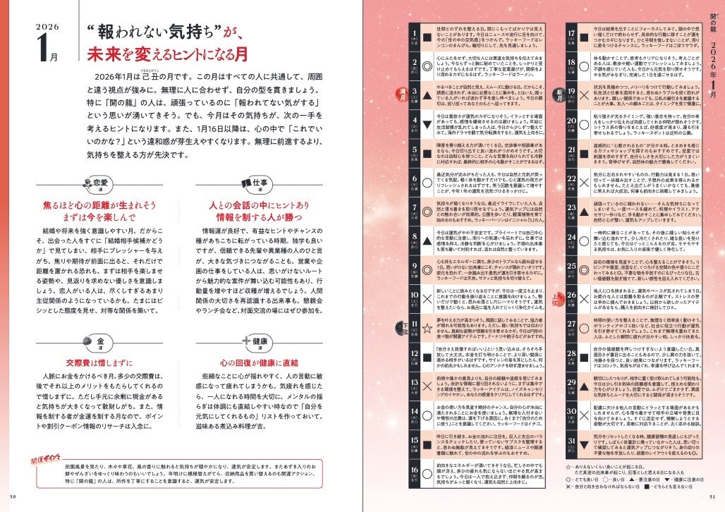 2026年の予言・注意点・開運法をはじめ、月ごとの運勢、毎日の運勢までを網羅。総合運・恋愛運・仕事運・金運・健康運を細かく読み解き、日々の流れを逃さずチェックできます。