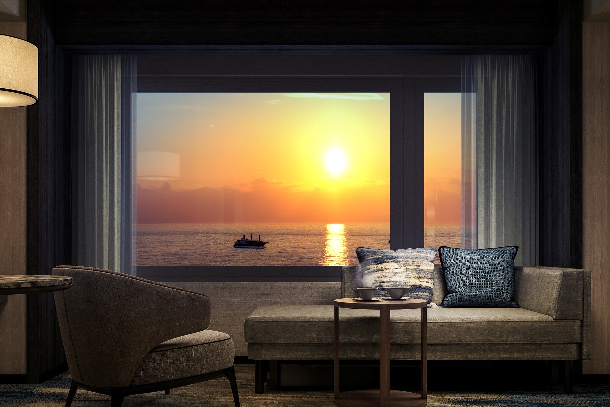 当ホテルは、大阪市内にありながら大阪湾に面し、海の眺望も楽しめるホテルです。40㎡、80㎡の客室のソファベッドや、スイートルームの寝室のソファを窓際に配することで、この場所だからこその絶景を臨み、時間とともに移り変わる景色が、寛ぎの時間を演出する客室に生まれ変わります。