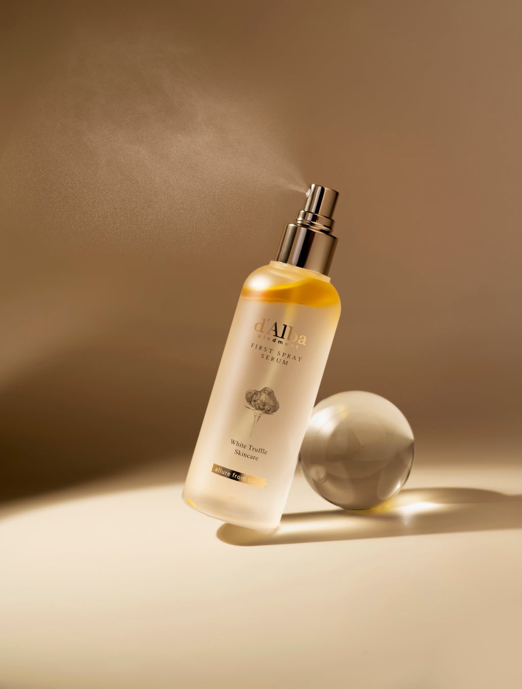 d’Albaの象徴的アイテムであるホワイトトリュフ配合のファーストスプレーセラムは、乾燥しやすい湯上がりの肌を瞬時に潤し