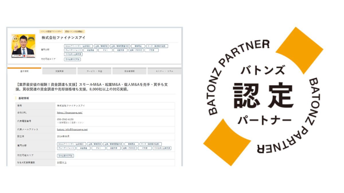 ファイナンスアイは、「1社でも多くの企業にファイナンスという活力を。継続的に成長していく支援をする事で、日本経済に貢献。」を理念に、起業家・個人事業主・中小企業の経営者に対し、成功報酬型で資金調達を支援しています。厳しい状況にある経営者にも積極的なサポートを行い、支援先はコロナ過にも負けず高い生存率を誇ります。ゼロゼロ融資による中小企業の倒産増加が顕在化してきた今、日本全国の経営者から毎日届く資金の悩み相談に対応し続けています。運営するWEBのオウンドメディアや各種SNSやLINE公式アカウントを通じて、大手金融機関出身者や財務コンサルタント、M&A支援機関のメンバーが監修した有益で視聴者や読者に分かりやすい情報を発信し続けています。サイトでは、融資が実現できる可能性を無料で診断するコンテンツも提供しており、毎日多くの経営者や起業家の皆様にご利用頂いています。ファイナンスアイでは資金調達だけではなく、経営者の様々な相談にも応じています。経済産業省中小企業庁のM&A支援機関登録制度にも登録済で、事業承継や小規模事業承継などによるM&Aの支援もしており、企業再生や経営改善といった困難な状況下で多くの経営者を支援してきた経験と知識を活かし、生存し続ける未来志向のサポートを提供しています。今回、日本最大級のM&Aプラットフォームである『BATONZ(バトンズ)』の認定パートナーとして活動を開始した事で、これまでの資金調達やファイナンスの支援にプラスして、中小企業の事業承継やスモールM&AやM&Aによる起業や個人のM&Aの支援を通通して、スタートアップの創出と育成、地方創生と日本経済の発展に寄与してまいります。
