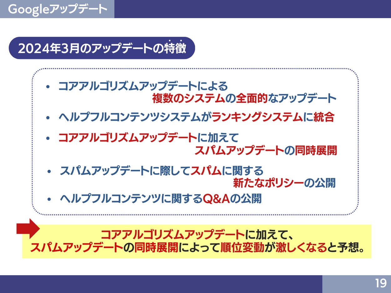 コアアルゴリズムアップデートに加えて、スパムアップデートの同時展開によって、順位の変動は激しくなると予測されます。