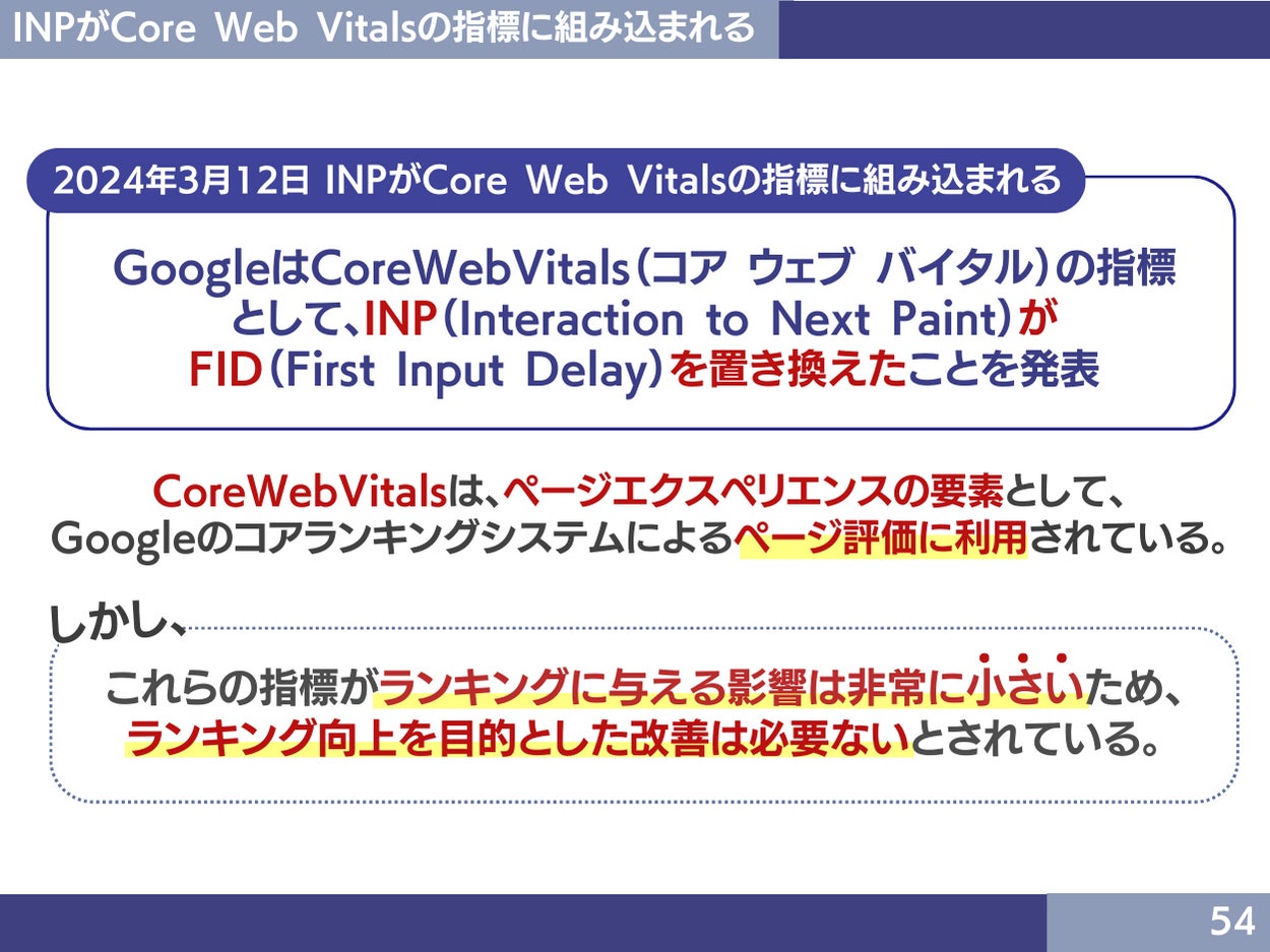 2024年3月12日に、GoogleはCore Web Vitals(コア ウェブ バイタル)の指標として、INP(Interaction to Next Paint)がFID(First Input Delay)を置き換えたことを発表しました。Core Web Vitalsは、ページエクスペリエンスの要素として、Googleのコアランキングシステムによるページ評価に利用されます。