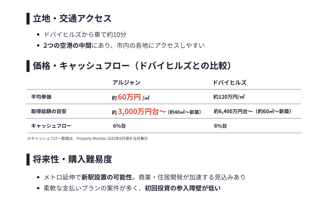本リリースでは、立地・価格・将来性の3軸でアルジャンをドバイ主要エリアと横並び比較し、その投資妙味を検証しました。