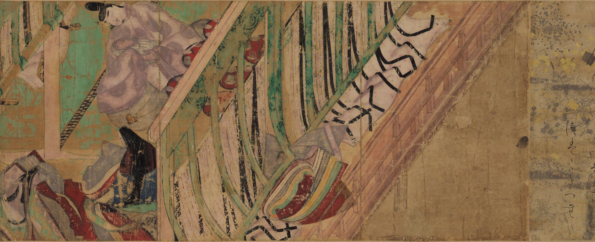 登場人物の顔は「引目鉤鼻(ひきめかぎばな)」という、目を細い線、鼻を「く」の字形で表す独特の様式で描かれています。一見、目は一本線のように見えますが、実際には何本もの細い線を重ねて瞳の位置を示しています。こうした繊細な描写によって、人物の表情にはわずかなニュアンスが付けられています。あえて強い個性を表現しないことで、鑑賞者がそれぞれの感情を想像し、感情移入しやすくなるとされています。