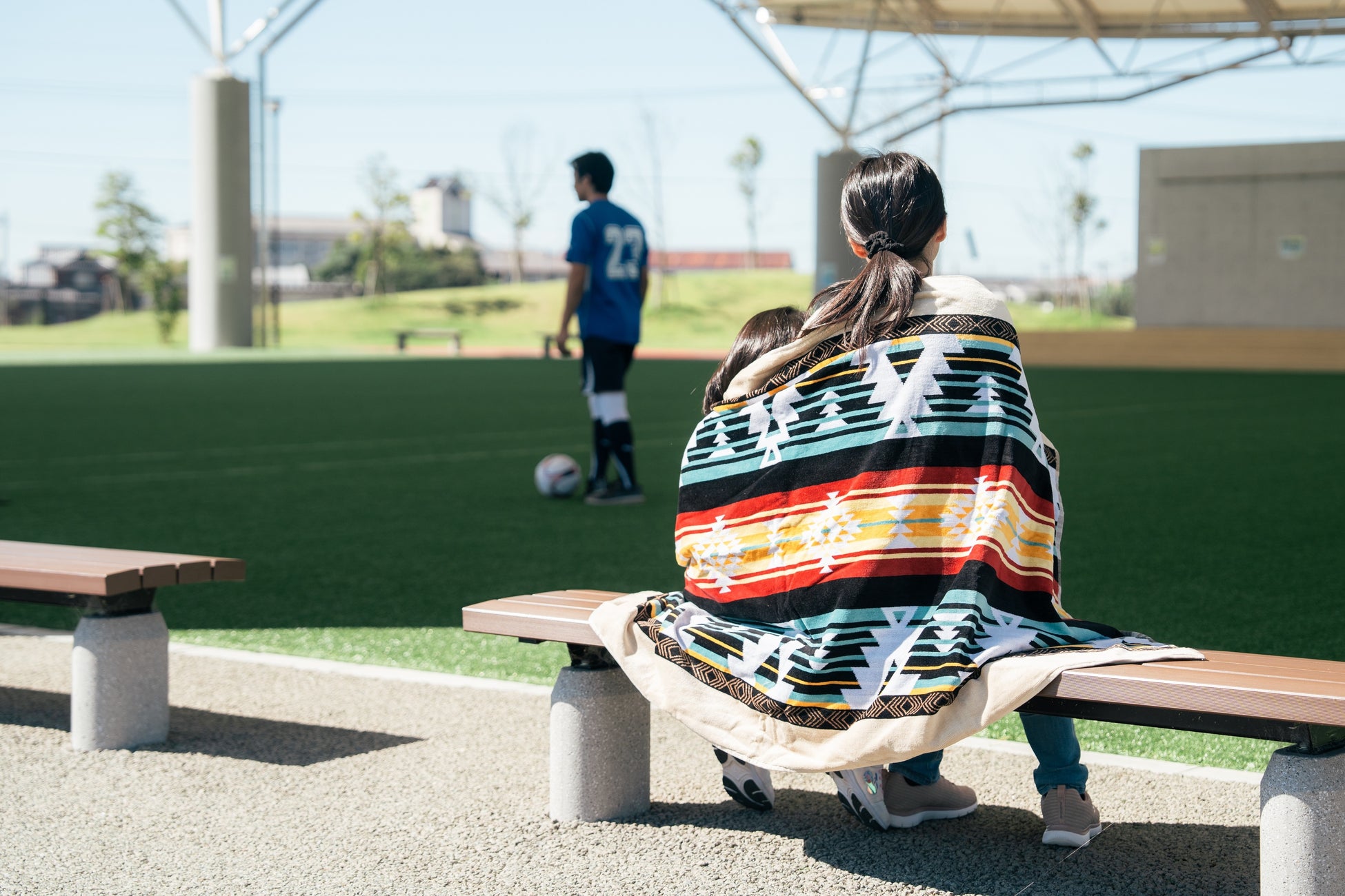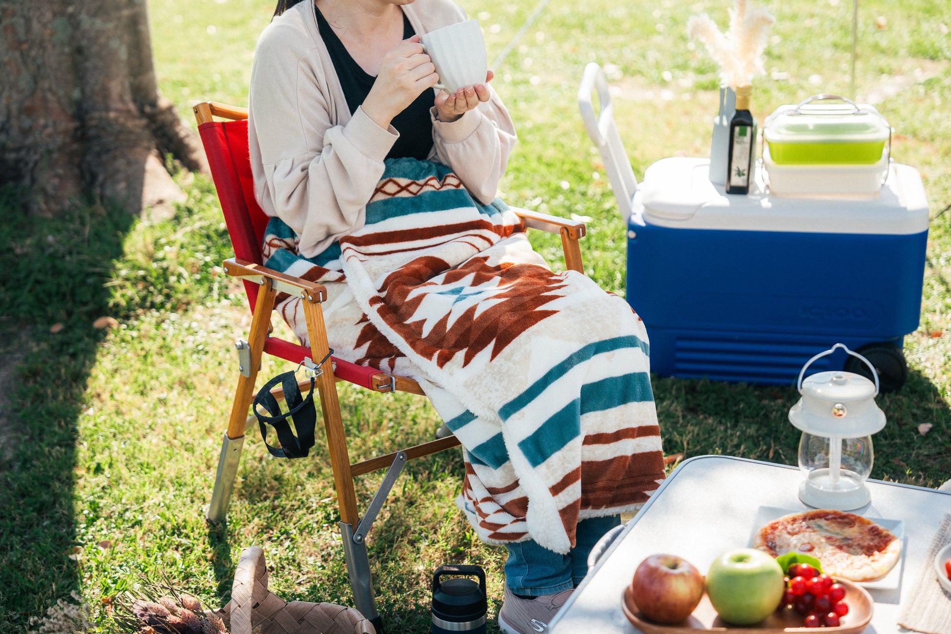 【特徴】腰から下半身をしっかり寒さから守ってくれるブランケット。BBQやスポーツ観戦、普段のお家でのくつろぎタイムにも。