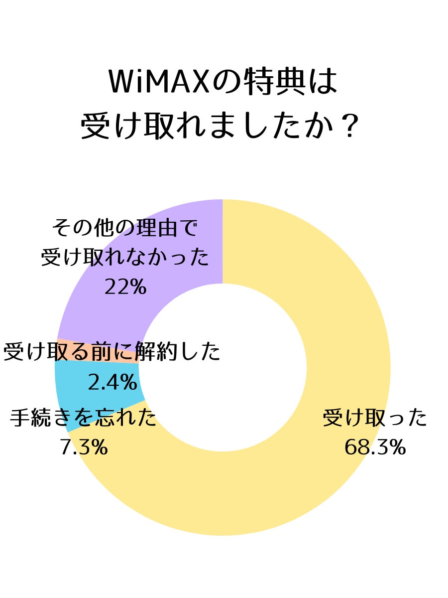 特典やキャッシュバックの満足度については、キャンペーンを利用しなかった方がおよそ30%いることや、利用した方でも特典を受け取り損ねた方がやはり30%程度いることから、WiMAXをよりお得に利用するために、キャンペーン内容についてよく理解をする必要があるといえるでしょう。