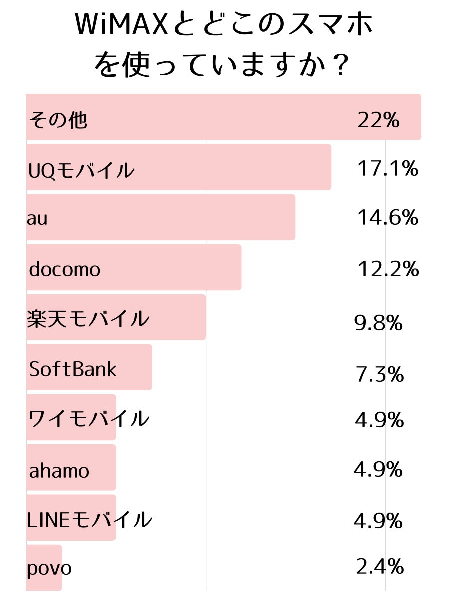 使っているスマホについては、その他のスマホが22%と多く、次にWiMAXでセット割が使えるUQモバイルが17.1%、auが14.6%となりました。