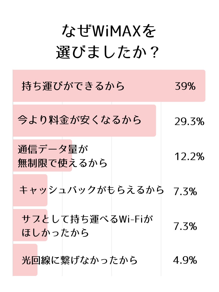 ・WiMAXを選んだ理由として「持ち運びができるから」が39%だった。