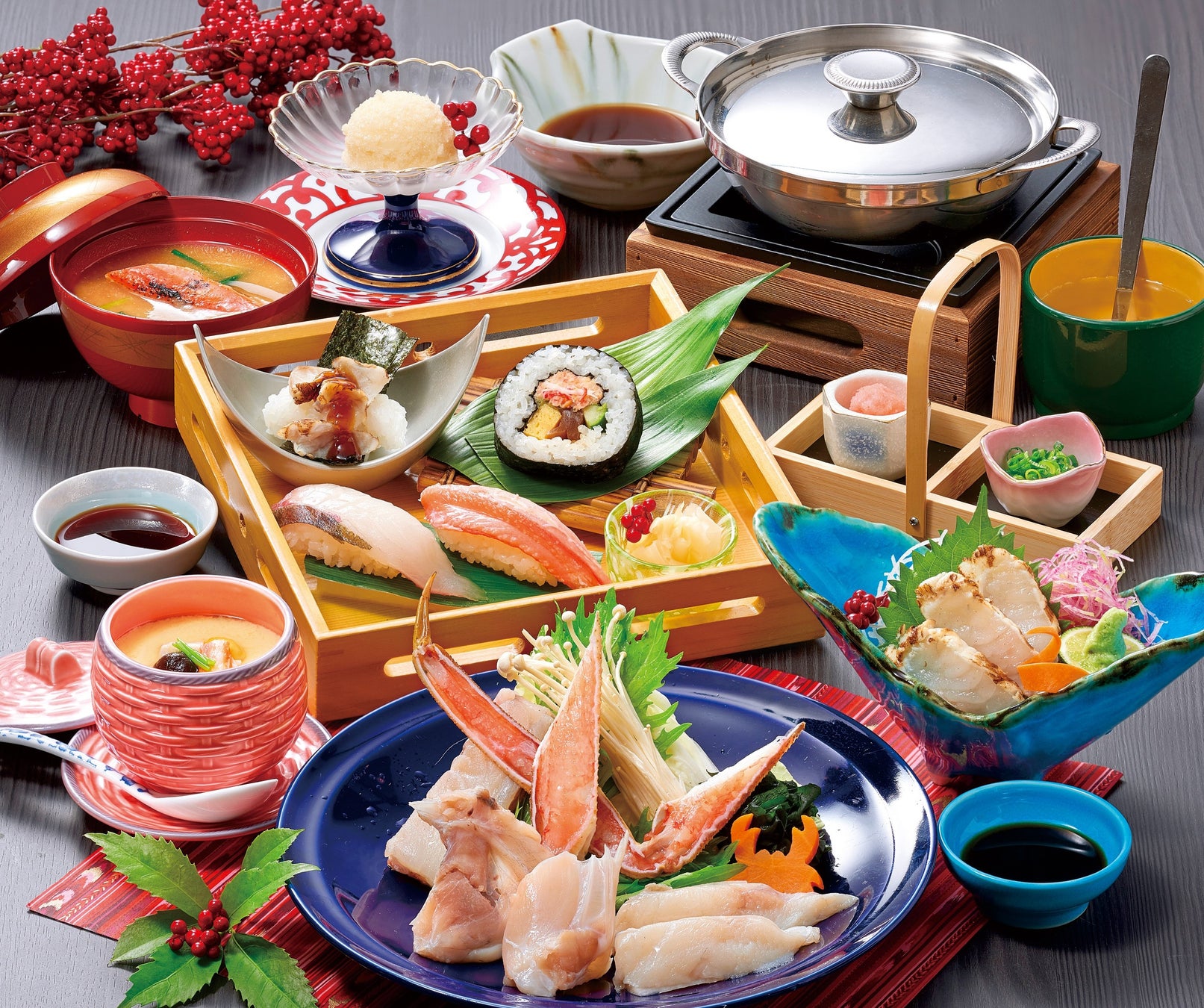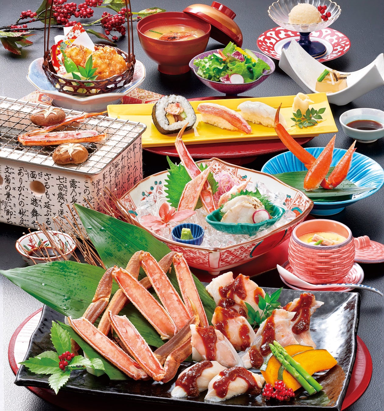 蟹とふぐの炭火焼きや寿司盛り合わせなど全10品のバラエティー豊かな味わいが楽しめます