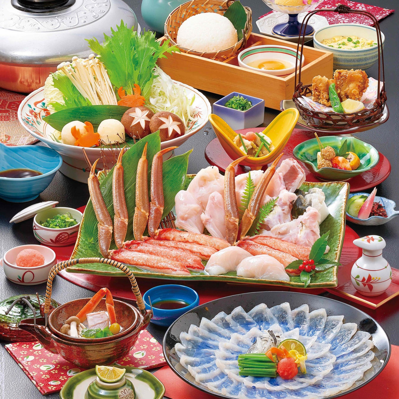 とらふぐのお造り、蟹ととらふぐのちり鍋や土瓶蒸しなど趣向を凝らした特選会席をご堪能ください