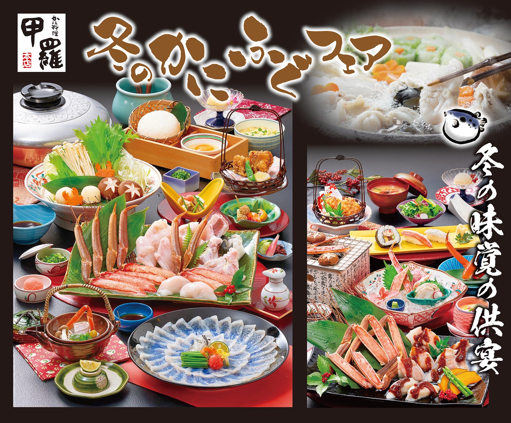 株式会社甲羅(本社:愛知県豊橋市、代表取締役社長:沼澤 裕)が全国で40店舗展開しているかに料理専門店「甲羅本店」では上質な蟹を熟練の調理人が素材の魅力を最大限に引き出しお客様へ提供いたします。また、旬の食材と蟹を掛け合わせた季節限定のフェアメニューにも力を入れており、年間を通して四季折々の味わいをお楽しみいただけます。この冬は11月1日(金)から来年1月31日(金)の期間で「冬のかにふぐフェア」を開催いたします。※一部店舗を除く
