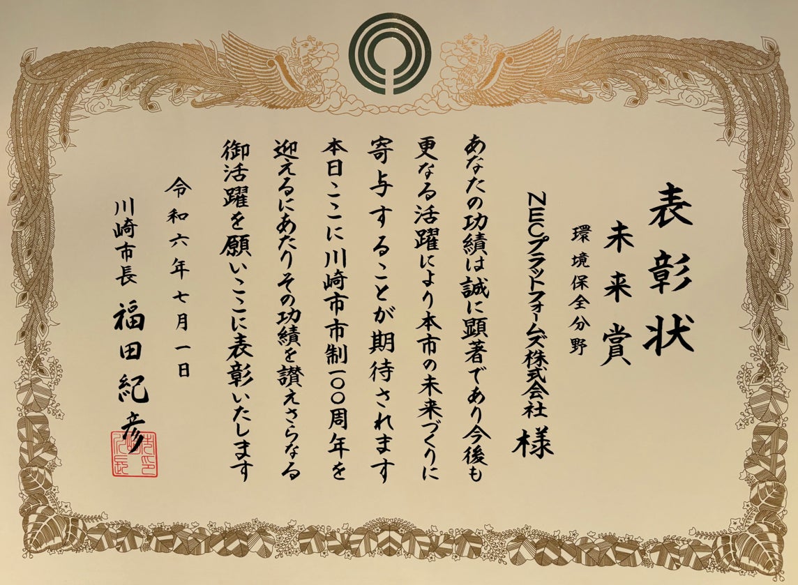 NECプラットフォームズ、川崎市市制100周年記念表彰者に選出