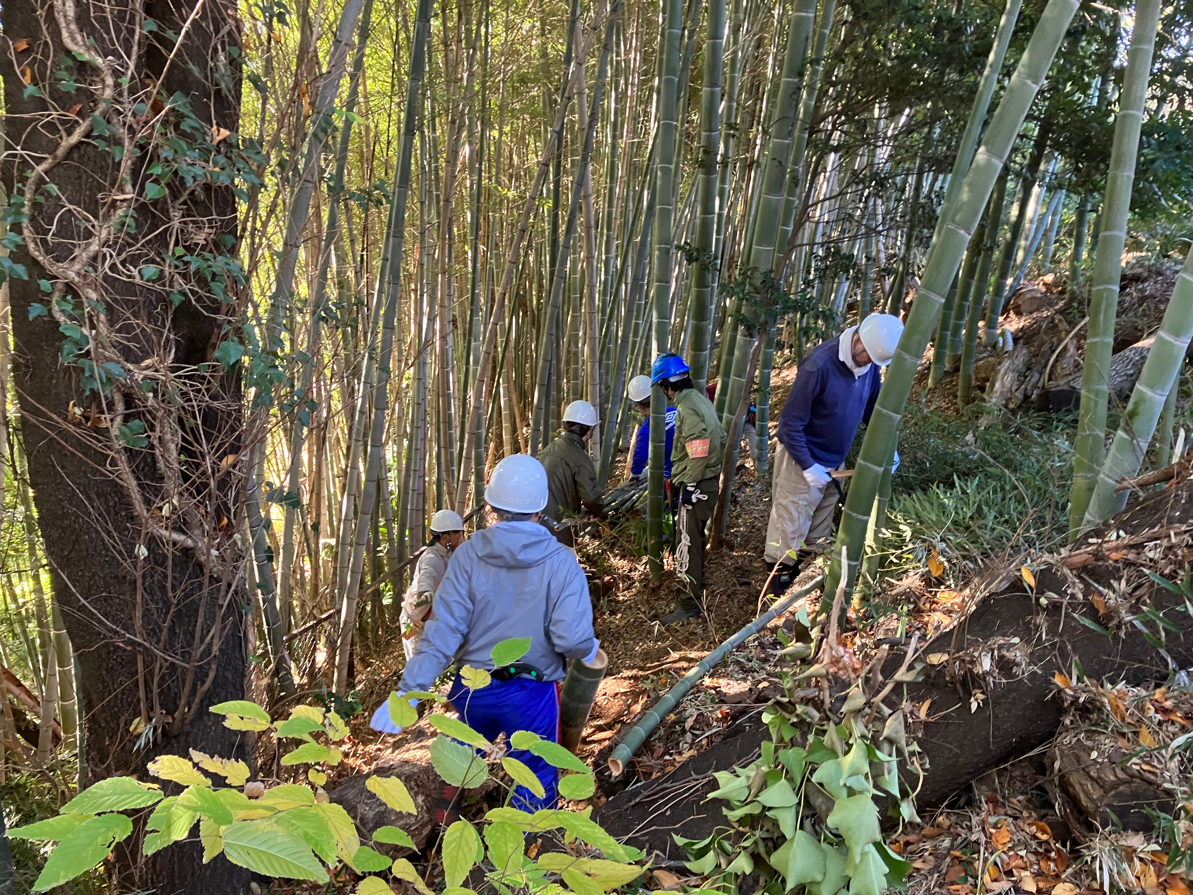 毎年春・秋に川崎市役所や公園緑地協会とともに、竹林内に日差しが入るように竹の間伐や、竹の繁殖を抑えるためのタケノコの駆除を行い、定期的な竹林整備を実施しています。