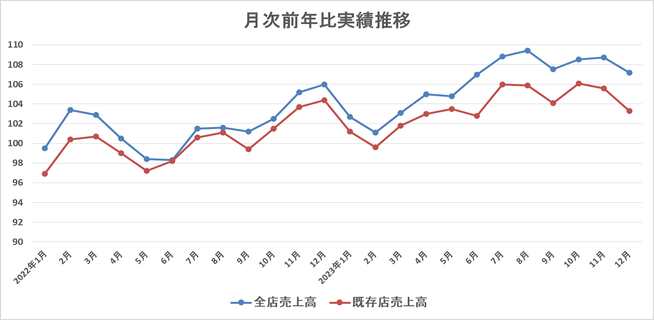 2023年6月から全店売上高に株式会社ハツトリーの実績を合算し、全店売上高は7.2%増だった。