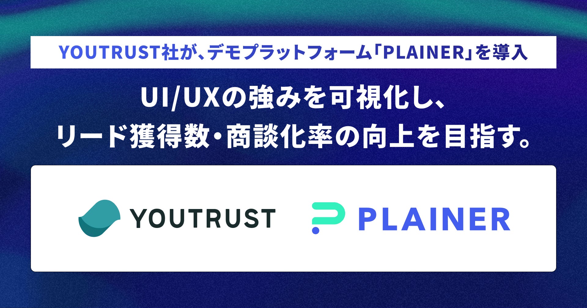 株式会社YOUTRUSTが、デモプラットフォーム「PLAINER」を導入。UI/UXの強みを可視化し、リード獲得数・商談化率の向上を目指す。