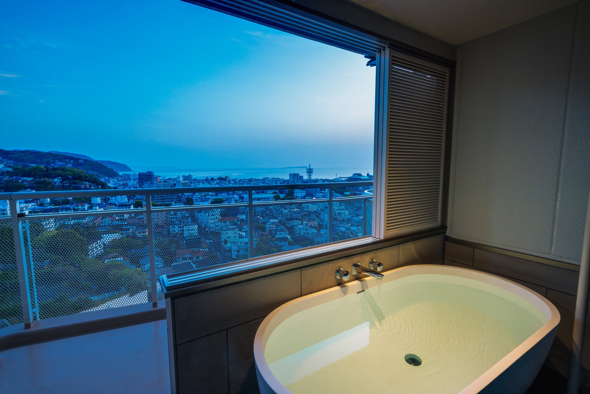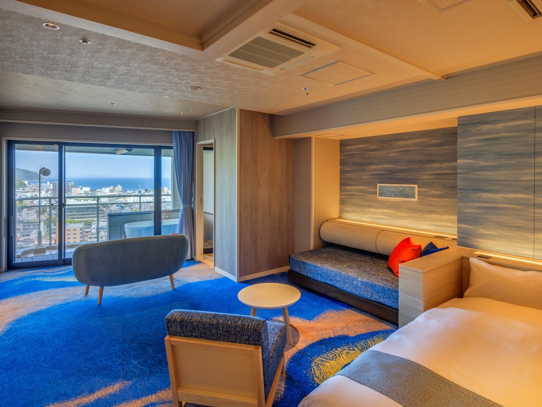 相模湾と初島、伊東の街を望む開放的な洋室。