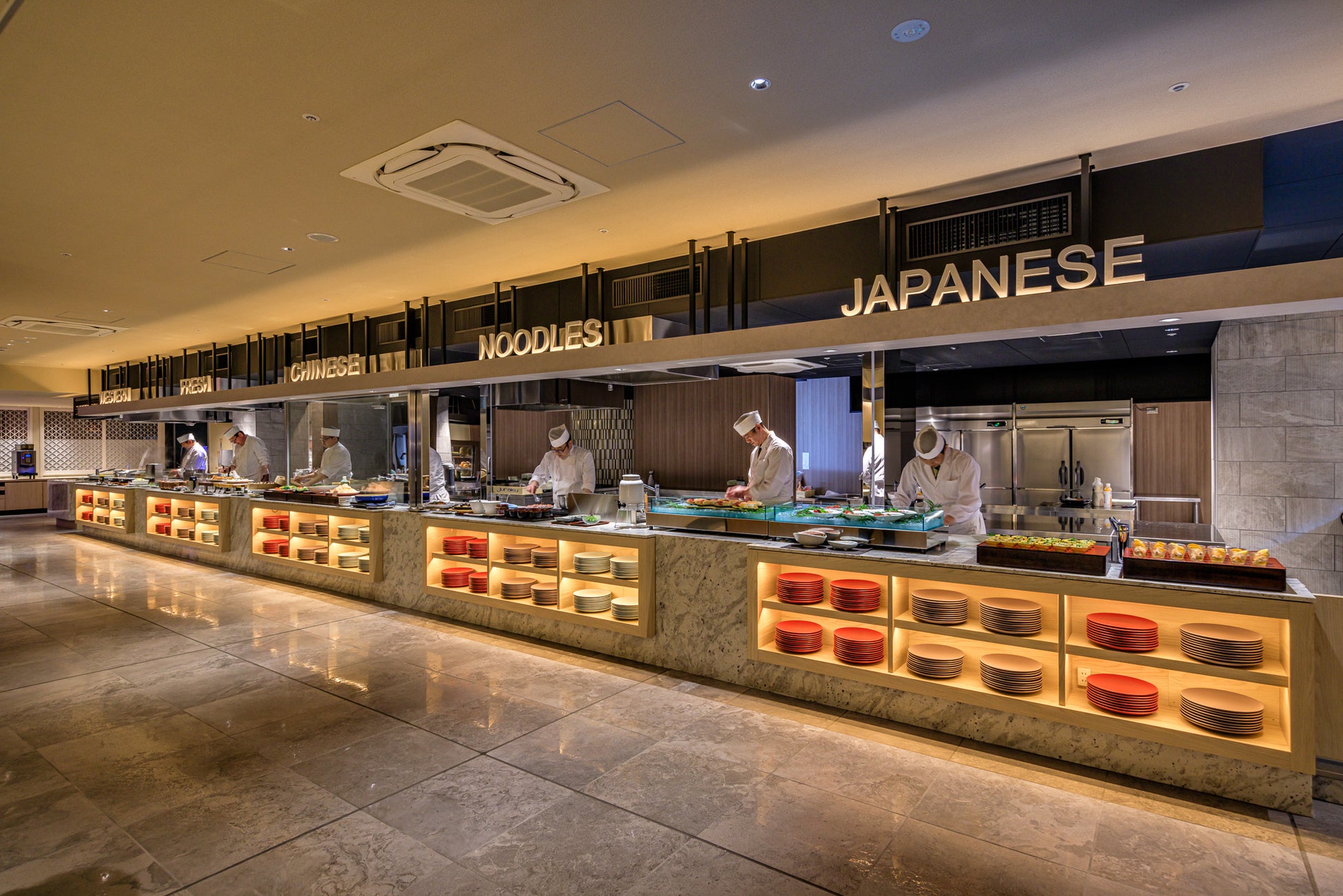 ライブキッチン「AMAHANA」では、伊豆の海の恵みと山の幸をダイナミックにアレンジした料理の数々を料理人が目の前で調理します。刺身、寿司、グリル料理、鉄板料理、洋食、中華など、出来たて、作りたてにこだわったジュラクならではのお料理をお楽しみいただけます。ドリンクもフリー。こだわりのワインやビールなど、自分好みでアレンジするソフトドリンク類もご用意しております。