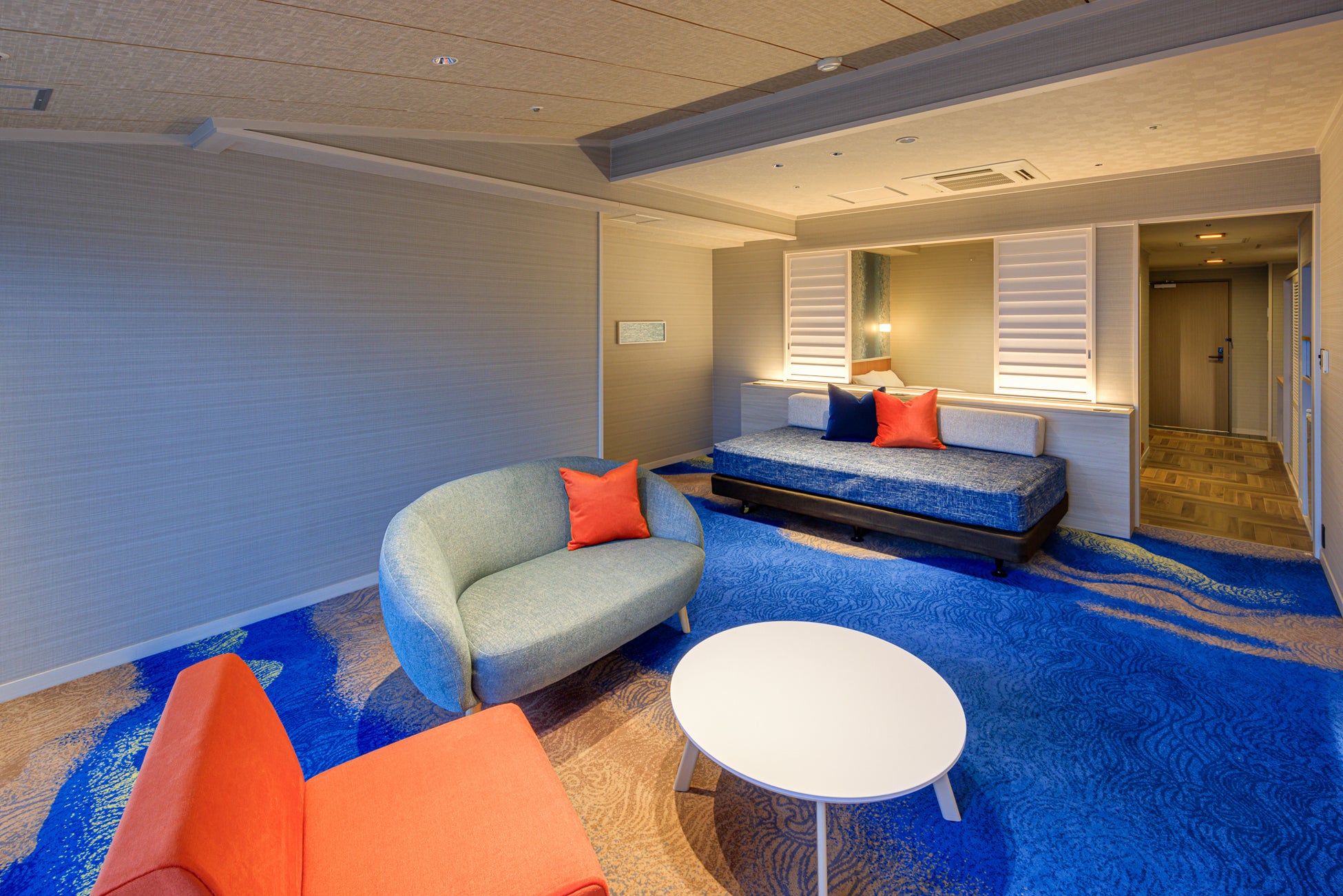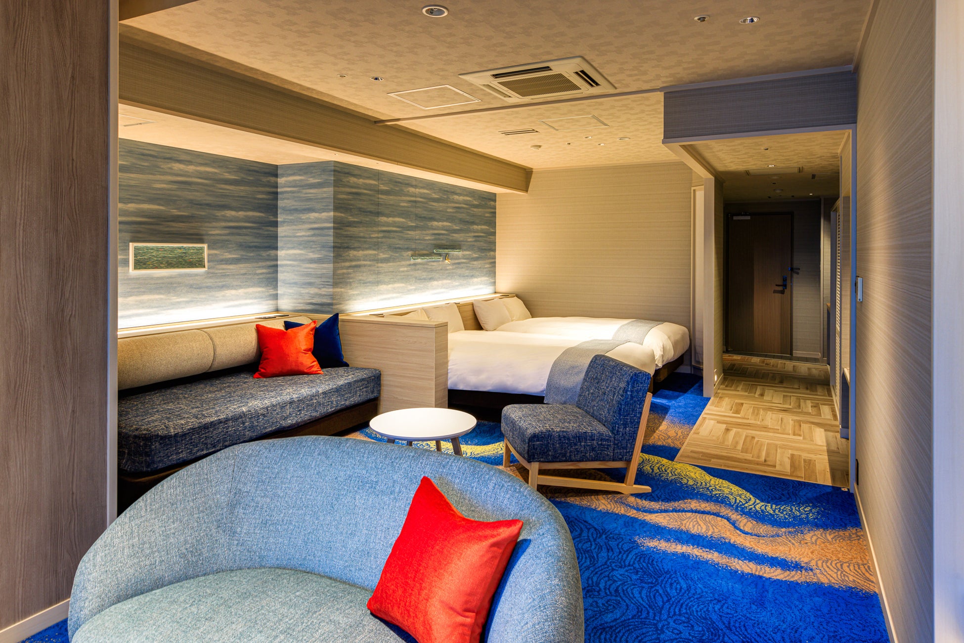 海と空のブルー基調としたデザインの客室は広さ44㎡、ゆったり空間をお楽しみください。