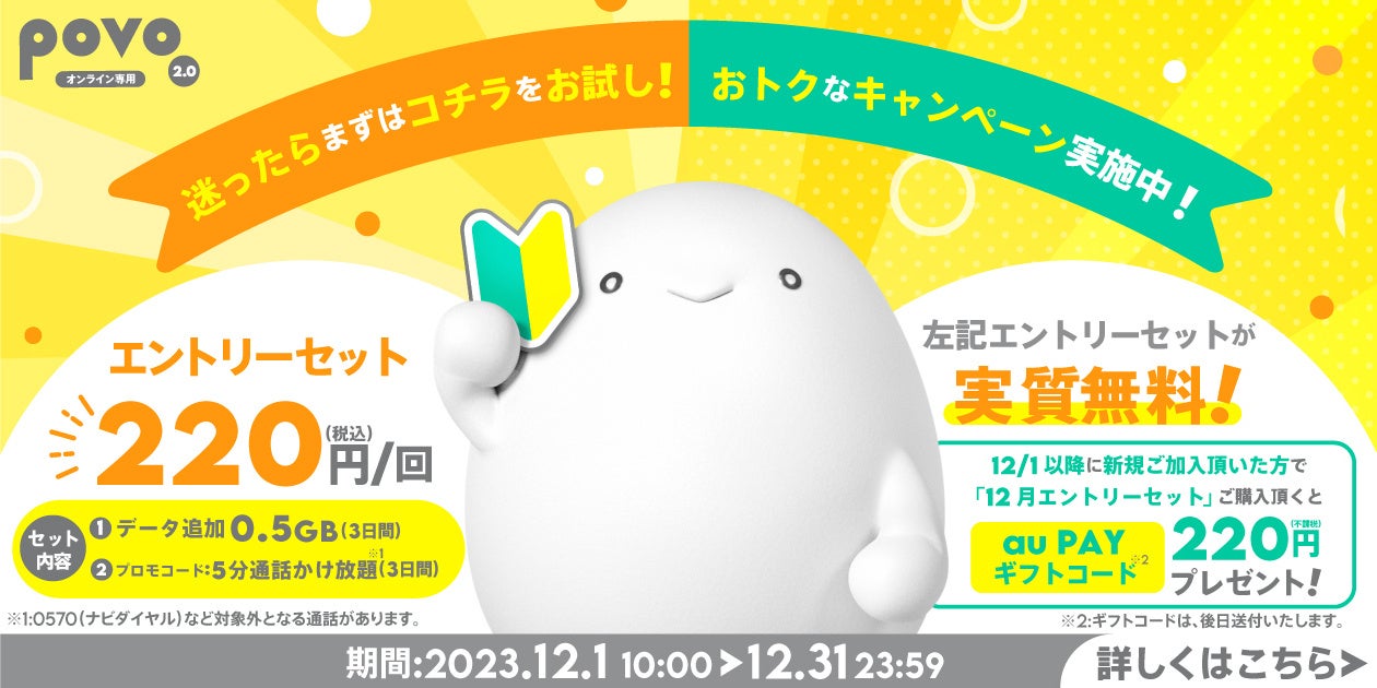 あわせて、povo2.0の新規加入かつ12月のエントリーセットの購入で、トッピング金額相当(220円分)のau PAY ギフトコードを還元するキャンペーンを実施します。