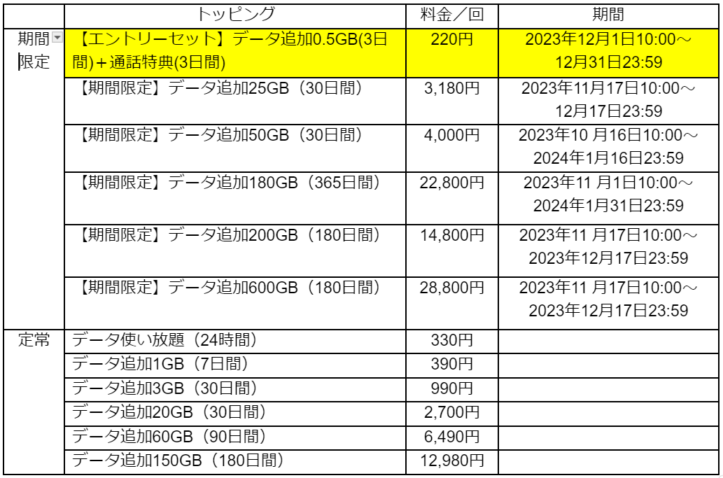 【エントリーセット】データ追加0.5GB(3日間) +通話特典(3日間) | 220円 | 2023年12月1日10:00~12月31日23:59 |