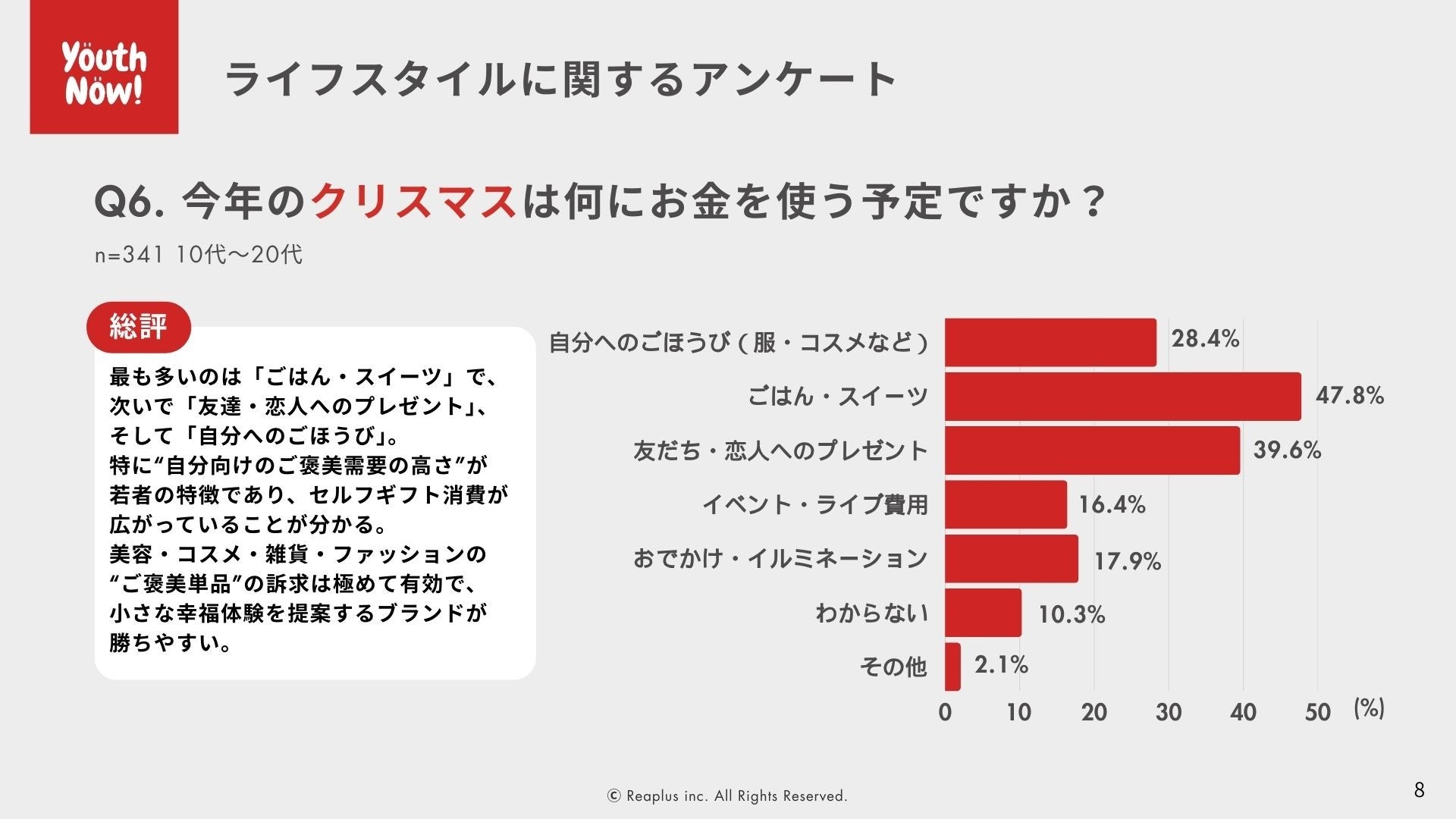 株式会社Reaplus [リアプラス](本社:東京都渋谷区、代表取締役:松元 詞音)は、消費者の“今”を可視化する次世代型インサイトマーケティングサービス「Youth Now!」を用いて、15〜29歳男女473名を対象に「クリスマスにおける参加/消費行動調査」を実施いたしました。