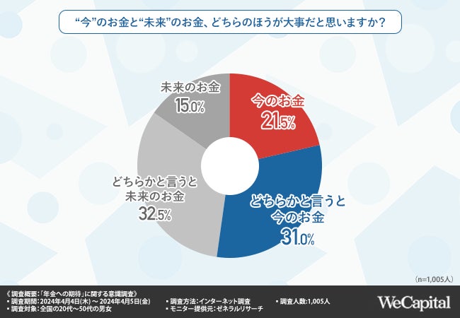 「“今”のお金と“未来”のお金、どちらのほうが大事だと思いますか?」と質問したところ、『今のお金(21.5%)』『どちらかと言うと今のお金(31.0%)』と、合計で過半数の方が今のお金のほうが大事だと考える傾向があることが明らかになりました。
