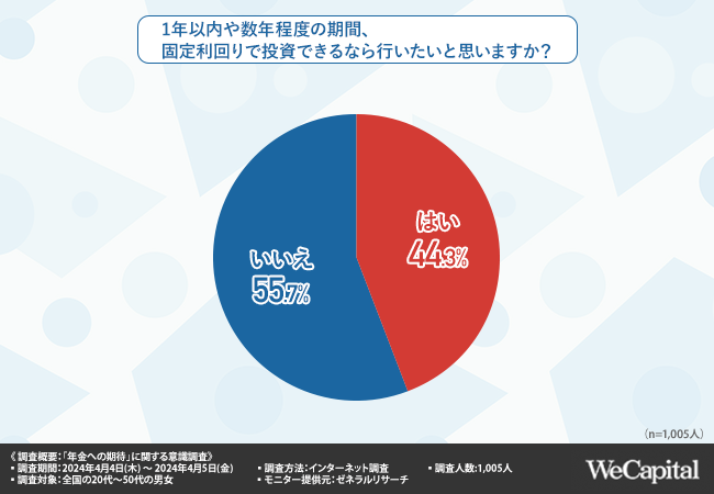 最後に、「1年以内や数年程度の期間、固定利回りで投資できるなら行いたいと思いますか?」と質問したところ、『はい(44.3%)』『いいえ(55.7%)』と回答しました。