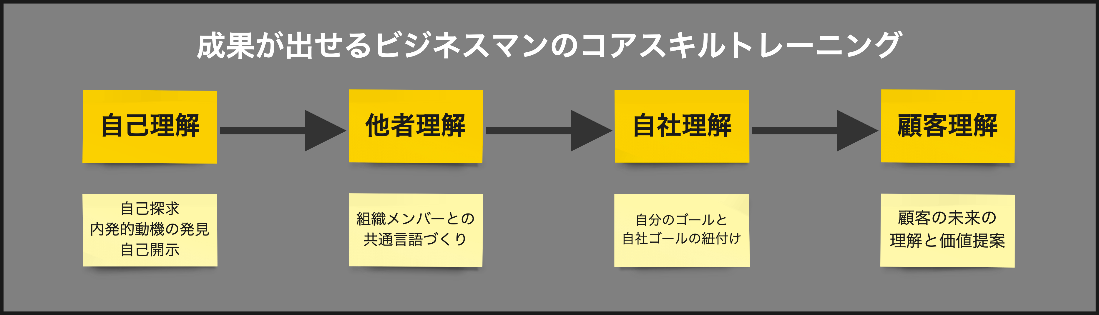 自己理解→他者理解→自社理解→顧客理解の繋がりを理解していただきます。自己理解により、目的意識を持ち自発的に動ける人材を育成し、他者理解では経営者層の視点を学ぶことができます。また、自社の理解を深めることが協業力の強化を実現し、組織分析力、ひいては顧客理解に繋がります。